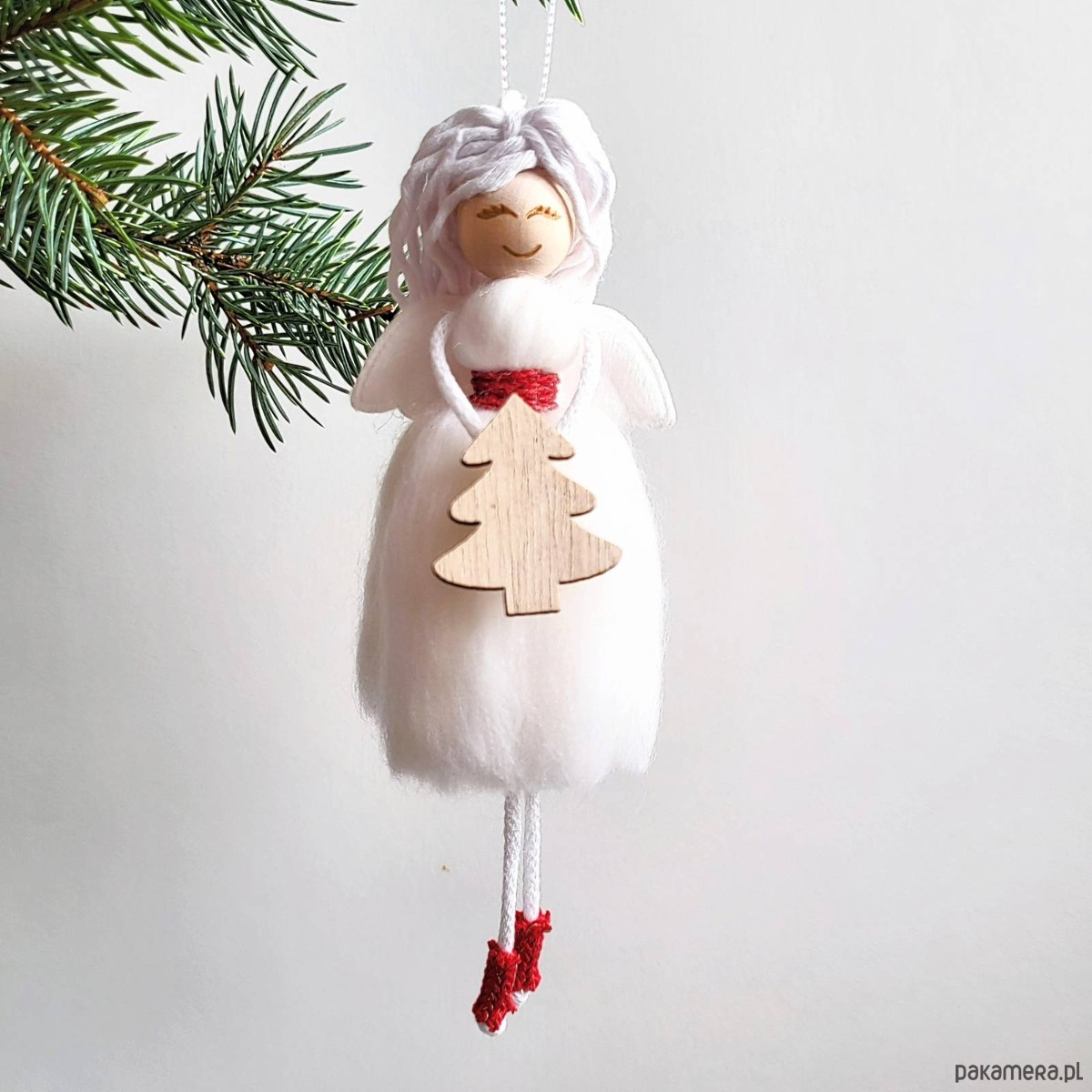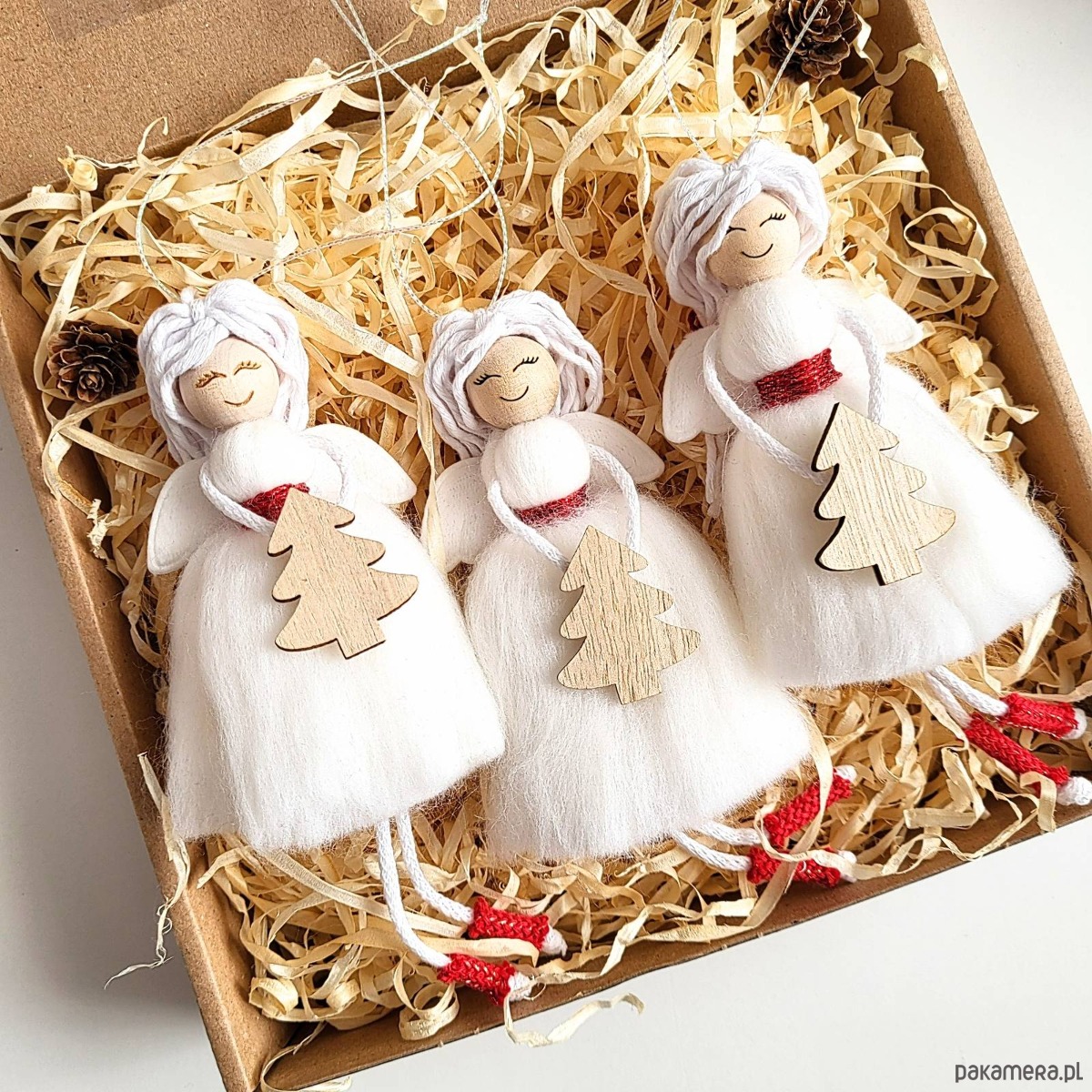 Aniołki z wełny czesankowej z czerwonymi dodatkami.
