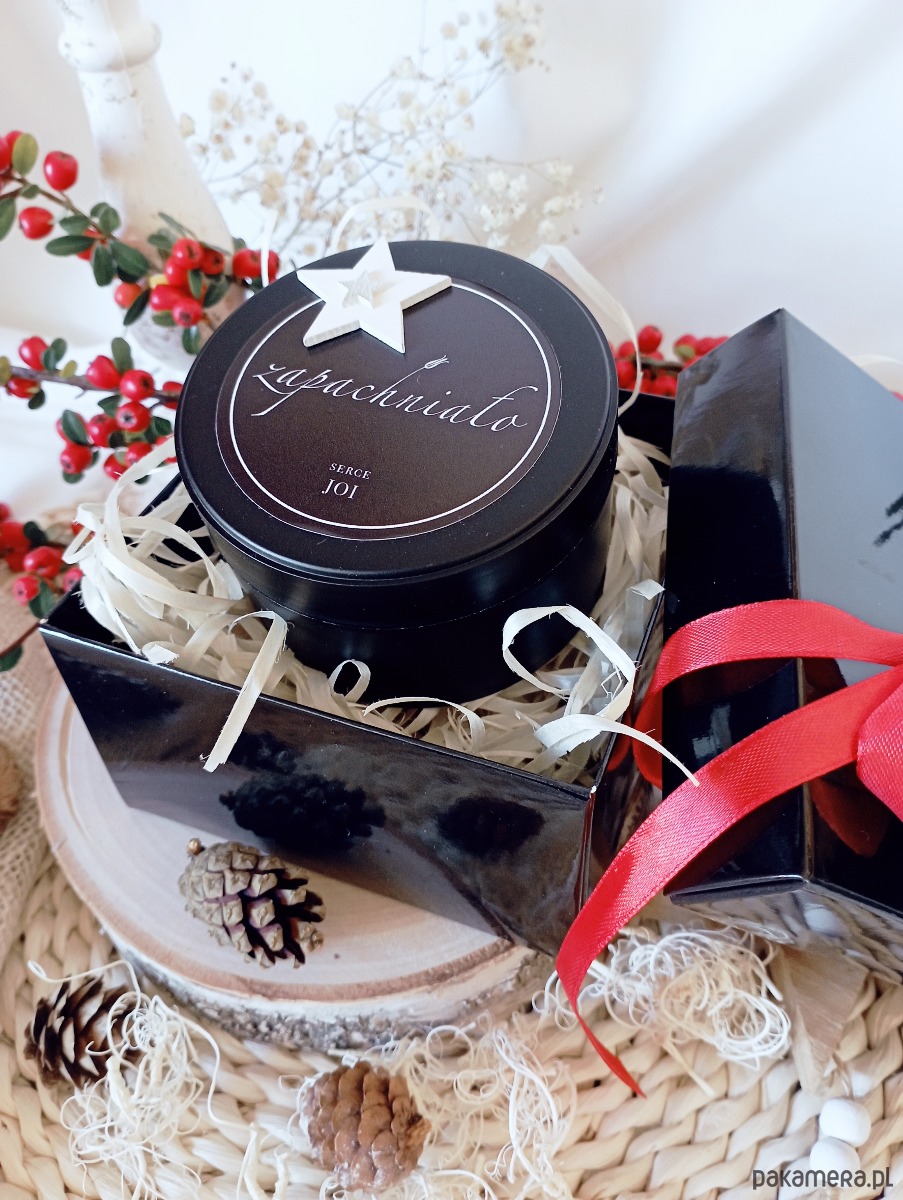 zestaw prezentowy to czarne, eleganckie pudełko z przykrywką, zawiązane złotą wstążka, w środku wyścielone białą, delikatną bibułą z uformowaną dekoracją nawiązującą do logo marki zapachniało oraz udekorowane elementami świątecznymi i czerwoną wstążką.