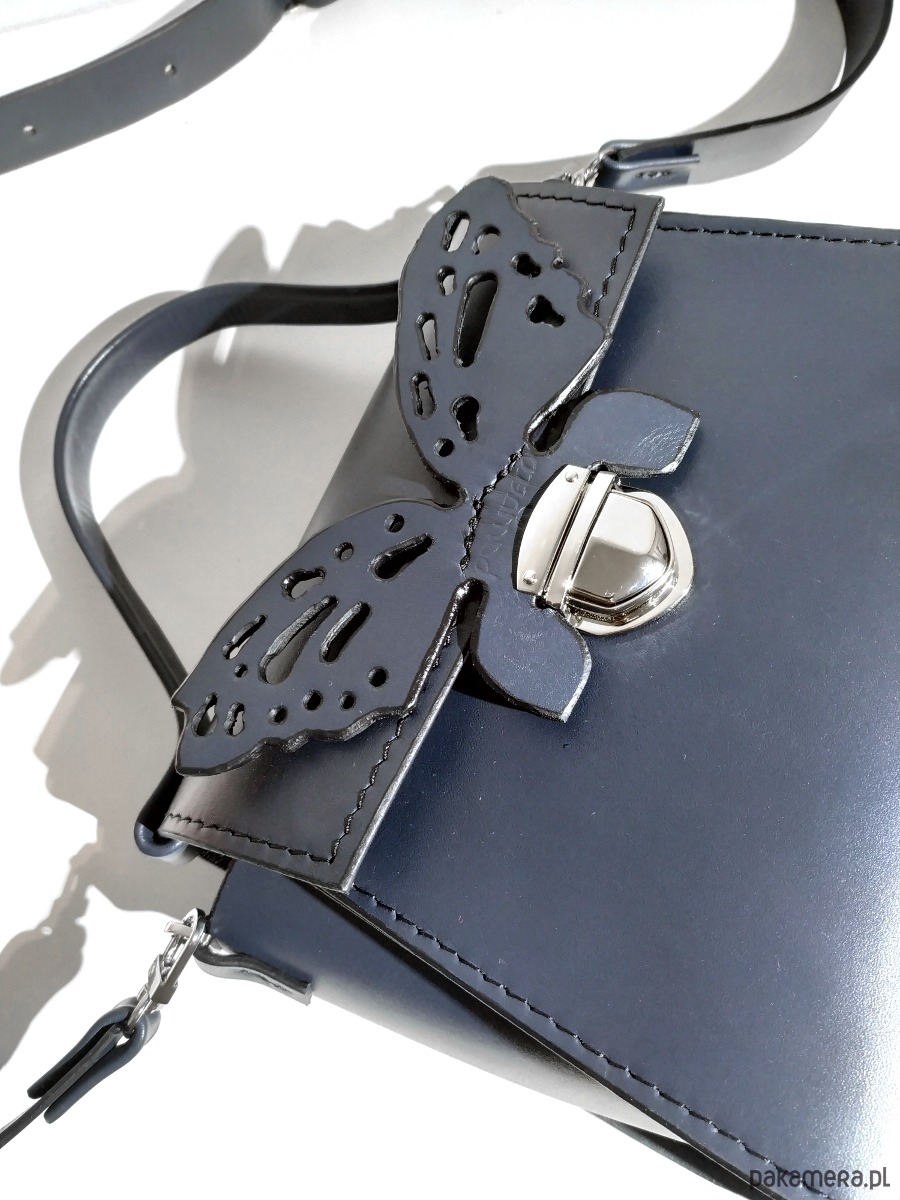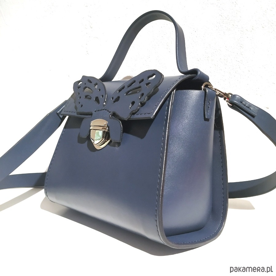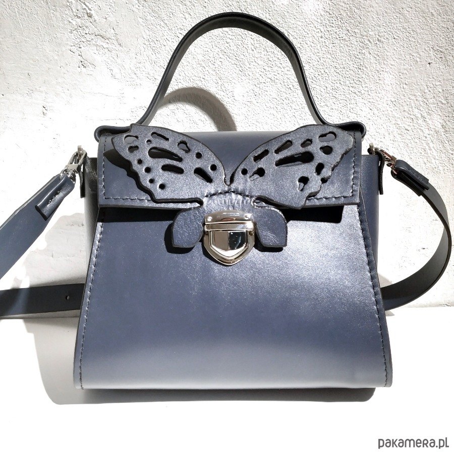 Oryginalny kuferek na ramię marki Pawdeco w odcieniu chmurny niebieski z autorską wycinanką motyla w skórze.