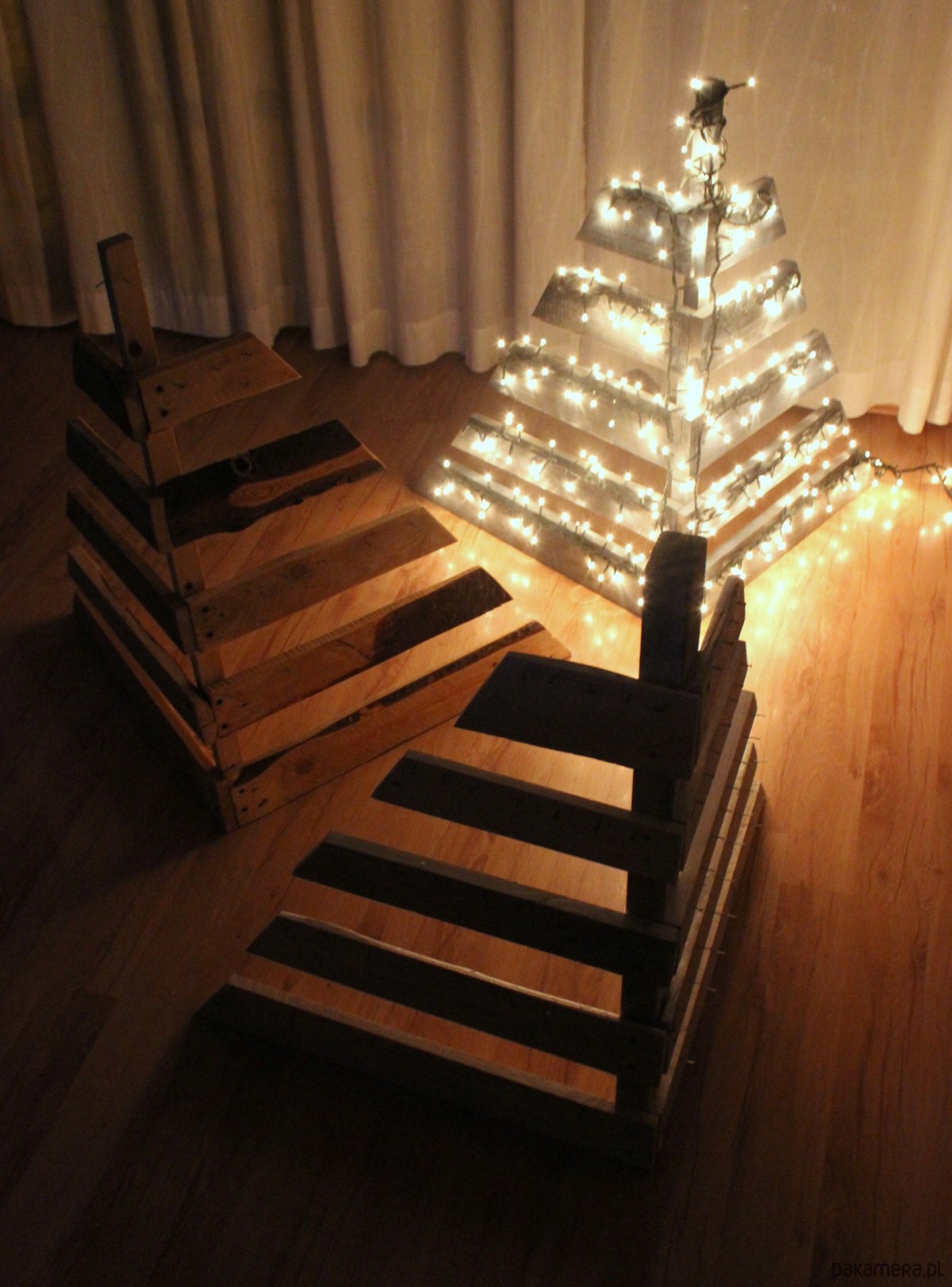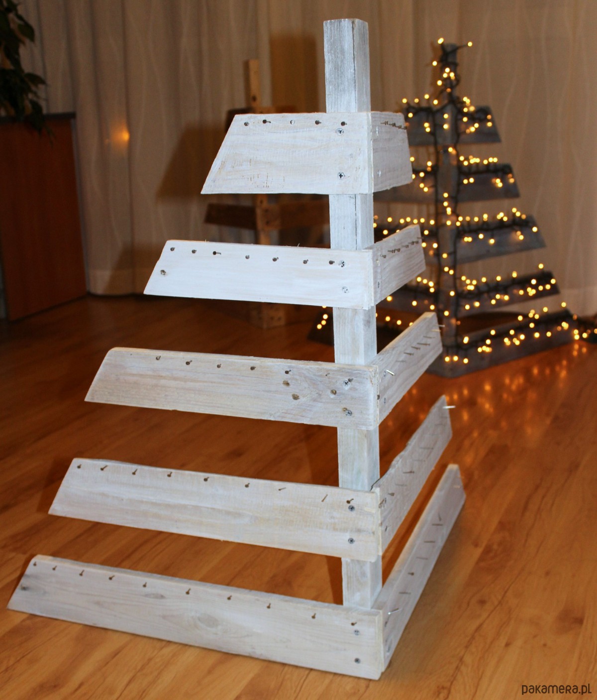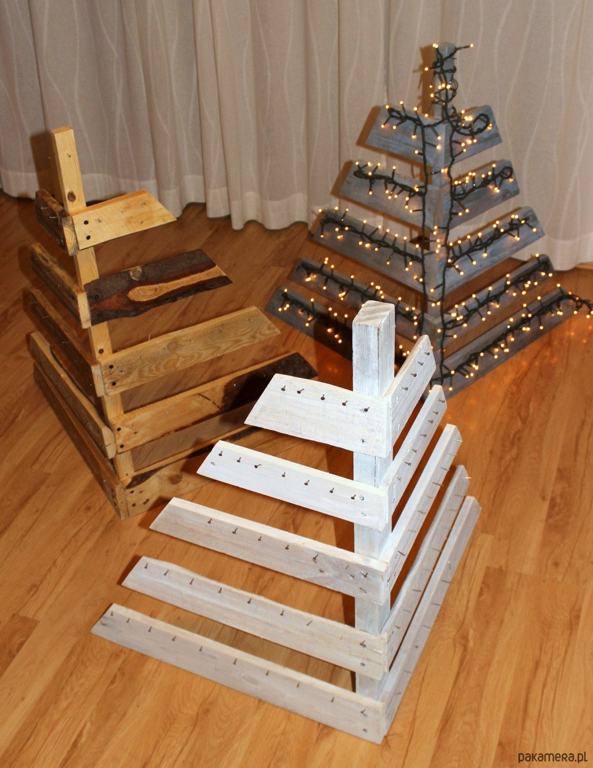Eko Święta przed nami! Czy masz już choinkę? Zamiast wycinać świeże drewka lub kupować plastikowe podróby choinek pomyśl o choince z palet! Z takiej igły nie spadają :D Potem może służyć za stojak/wieszak np na biżuterię ;) Tymczasem to wspaniała przestrzenna eko-dekoracja do domu, ogrodu czy na taras! Wybierz tylko kolor i robimy ;) Wymiary : wysokość 70cm szerokość u podstawy 60 cm Na indywidualne zamówienie mogą być też w innych rozmiarach. *cena za jedną sztukę