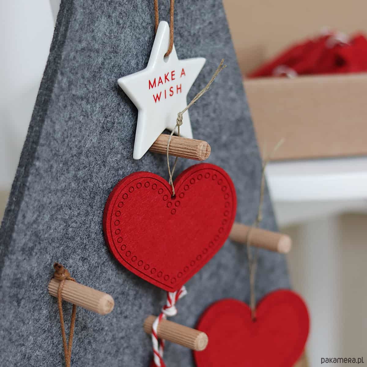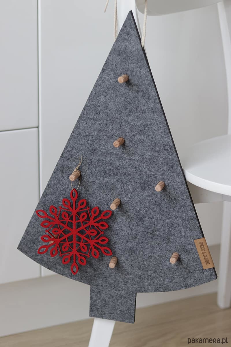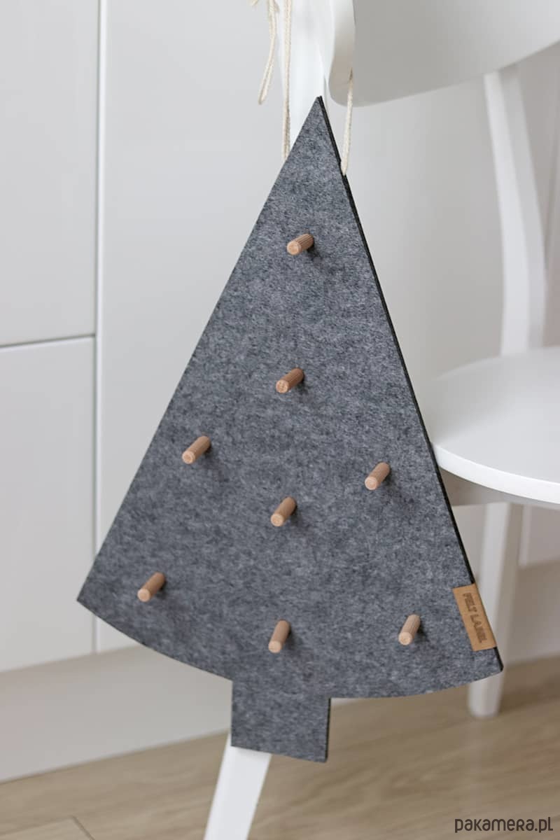 Dekoracja świąteczna w minimalistycznym, skandynawskim stylu. Połączenie filcu i drewna – ponadczasowe. Choinka sklejona z dwóch warstw filcu co nadaje jej trójwymiarowości i sztywności. Świetnie sprawdzi się w nowoczesnych wnętrzach. Będzie idealnym prezentem dla kogoś lubiącego niebanalne dodatki do domu. Drzewko filcowe jest alternatywą dla żywych choinek, czy ich plastikowych wersji. Jest idealnym rozwiązaniem do małych mieszkań, czy niewielkich pomieszczeń. Zajmuje mało miejsca w przechowaniu do „następnego roku”. Na drewnianych, przechodzących na wylot kołkach można powiesić ulubione ozdoby lub światełka.