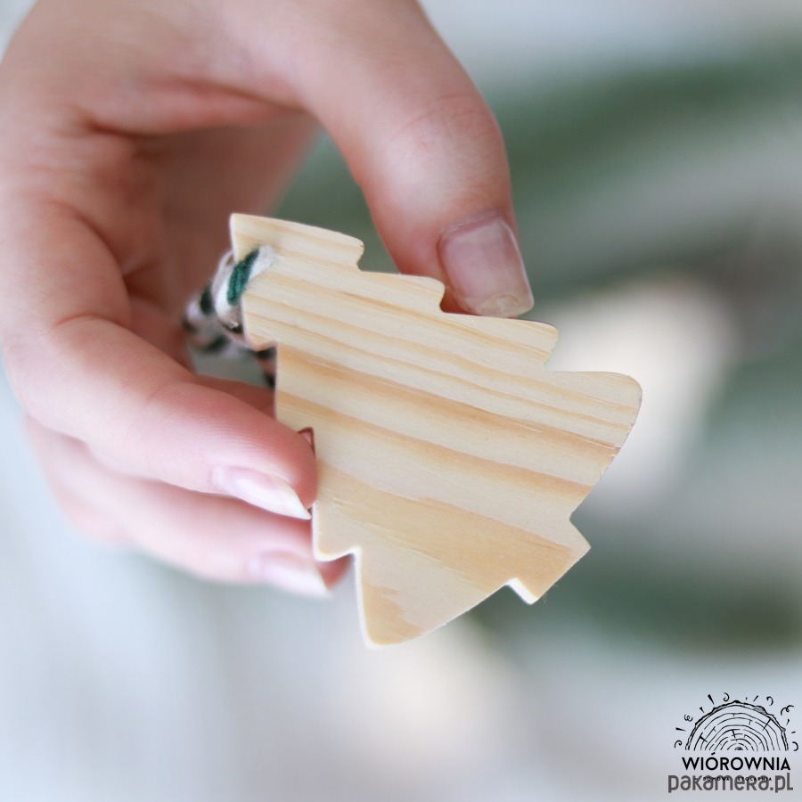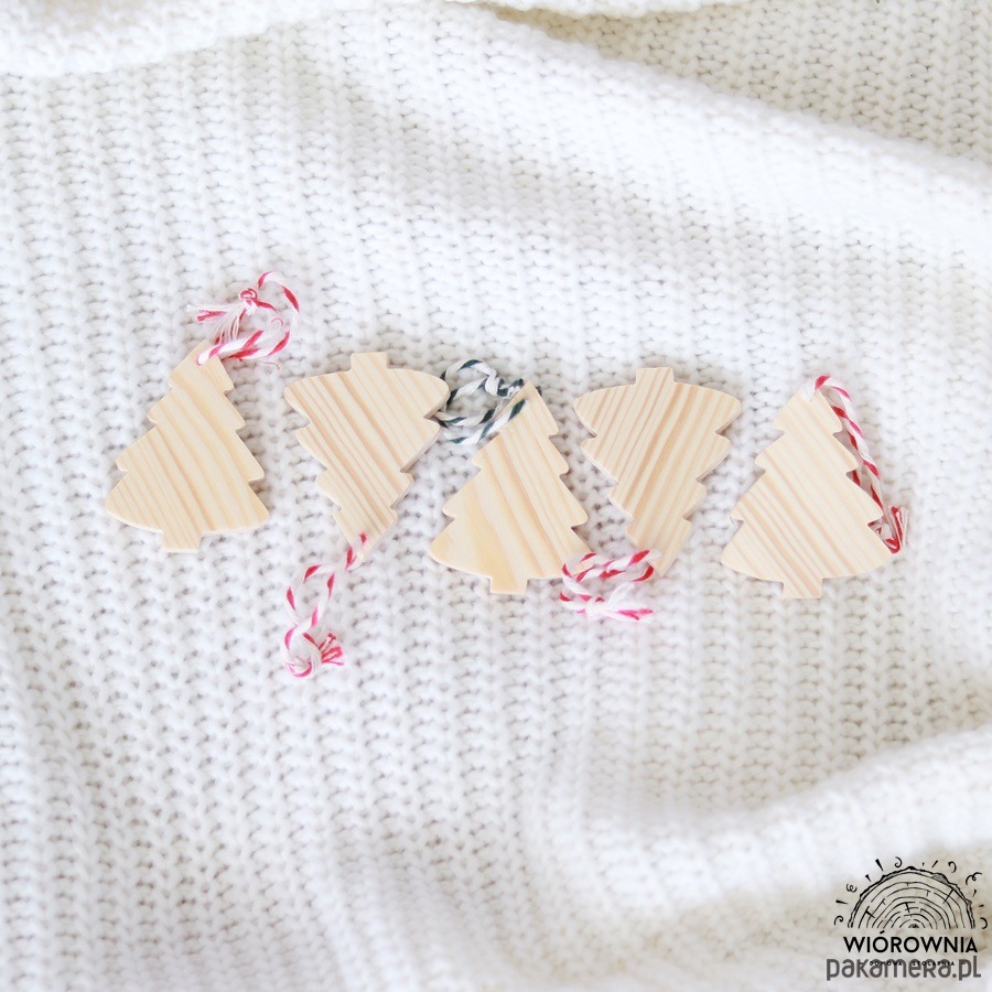 Komplet 5 sztuk drewnianych zawieszek w kształcie choinek, wykonanych w całości ręcznie z drewna sosnowego. Do każdej dołączony kolorowy sznureczek.