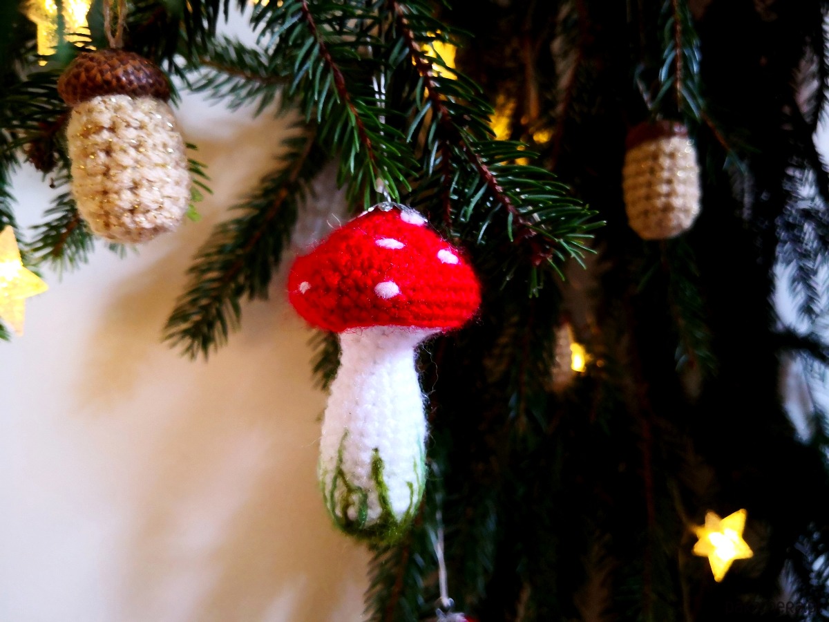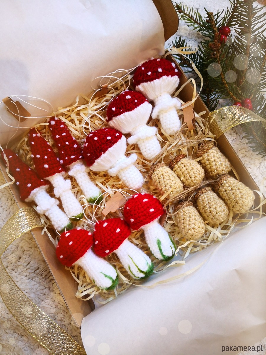 Muchomorki wykonane są na szydełku. Idealnie nadają się jako zawieszki na choinkę czy element dekoracyjny świątecznego stroika.