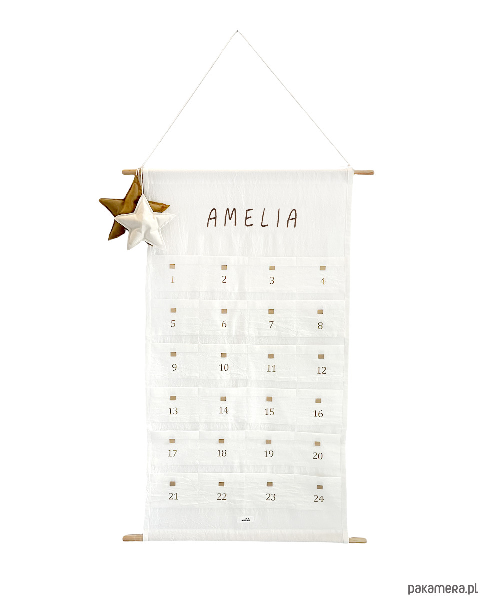 Imienny kalendarz adwentowy wykonany jest z bawełny washed cotton. Kieszonki i tasiemkowe lupki pozwalają na schowanie i przywiązanie drobnych podarków dla Waszych pociech. Napis na kalendarzu jest wyhaftowany co nadaje niezwykłego uroku. Sztywności całości nadają dwa sosnowe wałeczki. Dodatkową dekoracją kalendarza są dwie aksamitne gwiazdki.