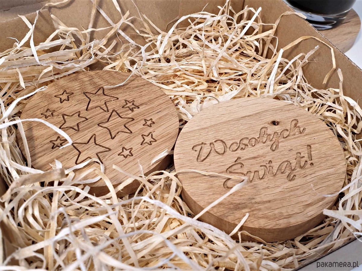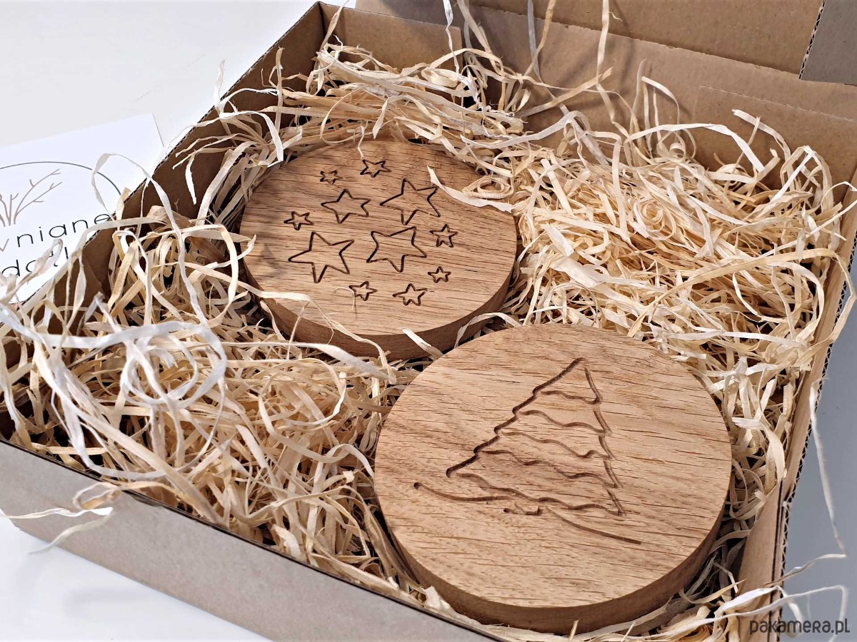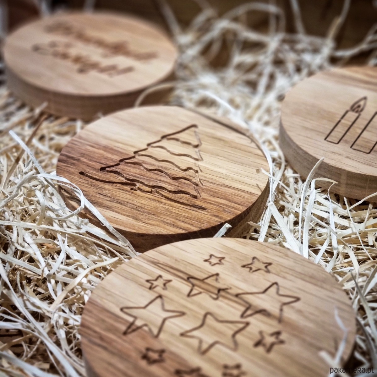 Przepiękne i praktyczne, idealne na prezent - podstawki pod kubek, wykonane jak zawsze u nas - w całości z litego drewna. W tym przypadku z tego, uznawanego za najszlachetniejszy gatunek - dębu. Podkładki ze świątecznym grawerem, zapakowane w ozdoby kartonik wypełniony naturalną wełną drzewną.