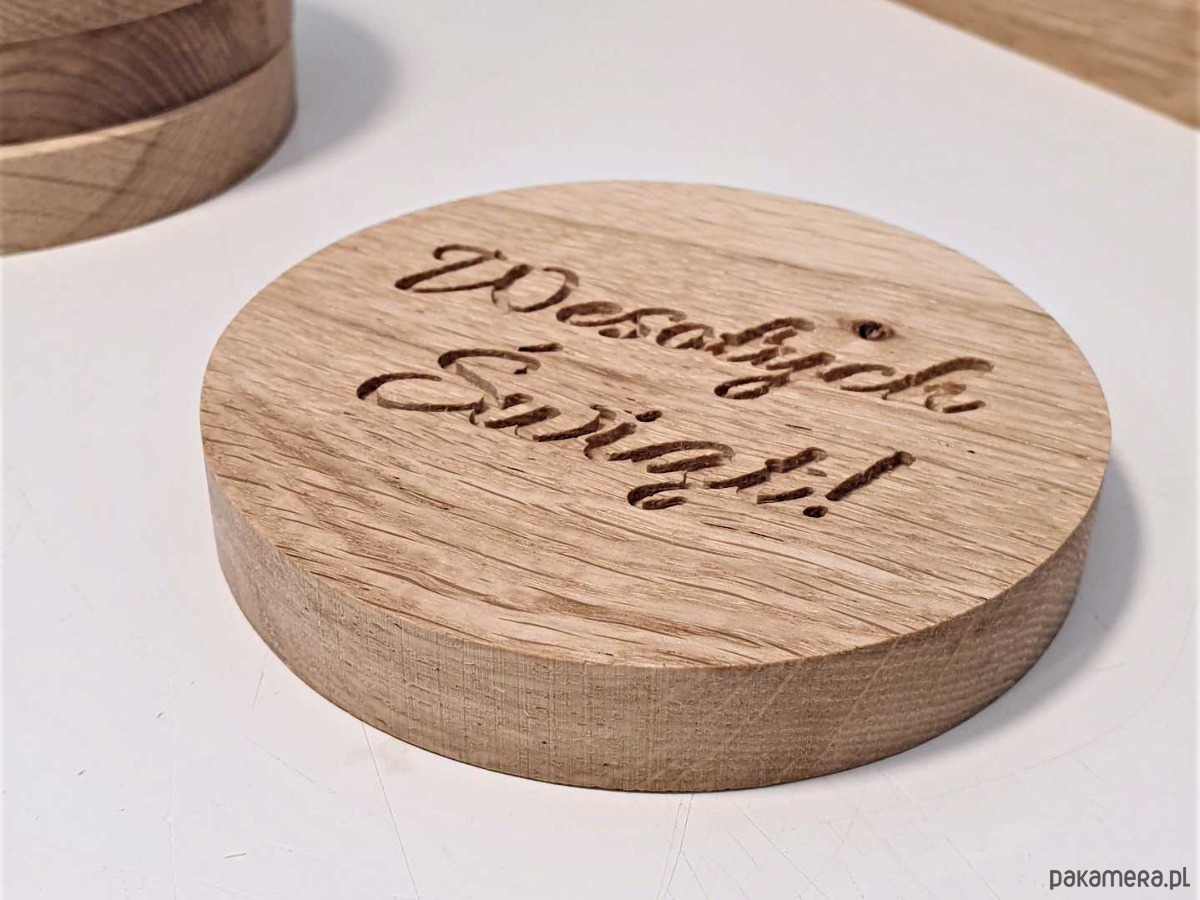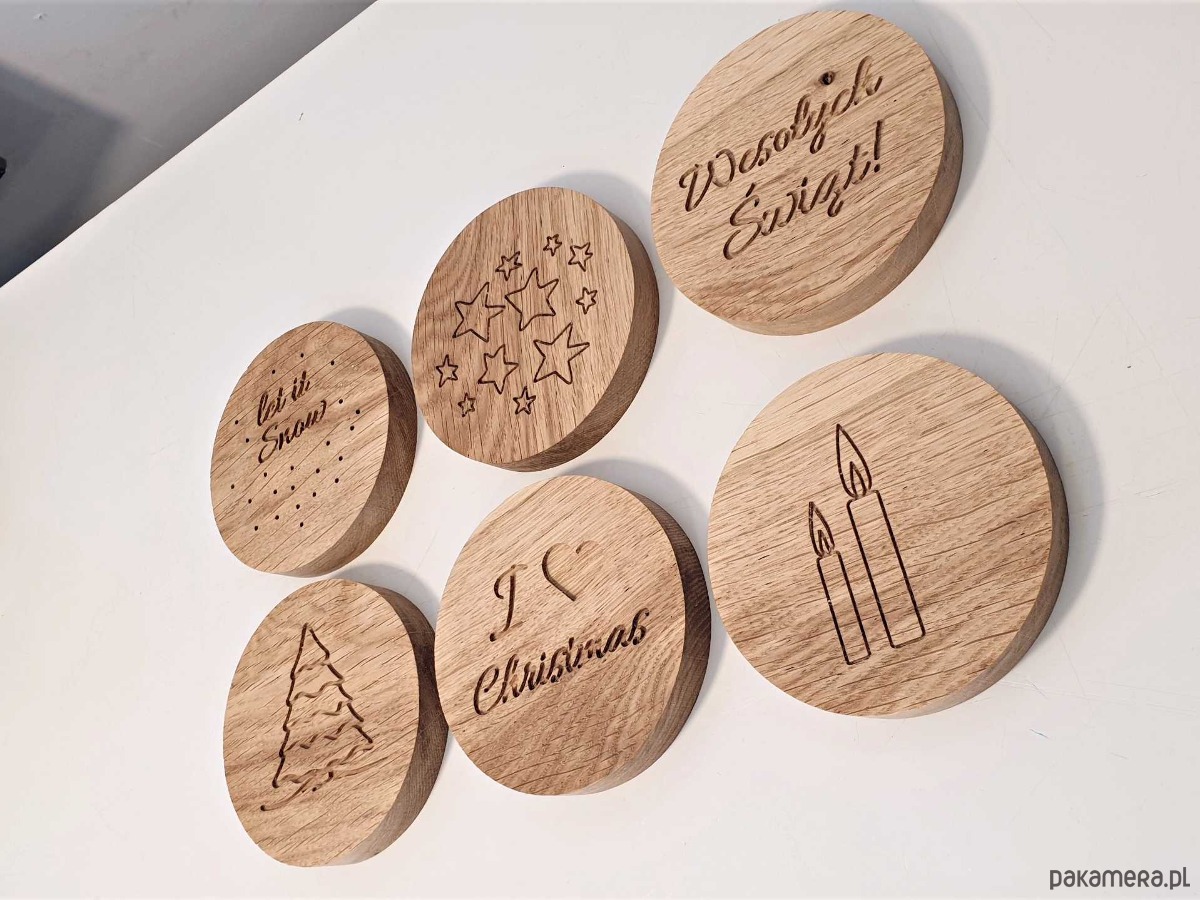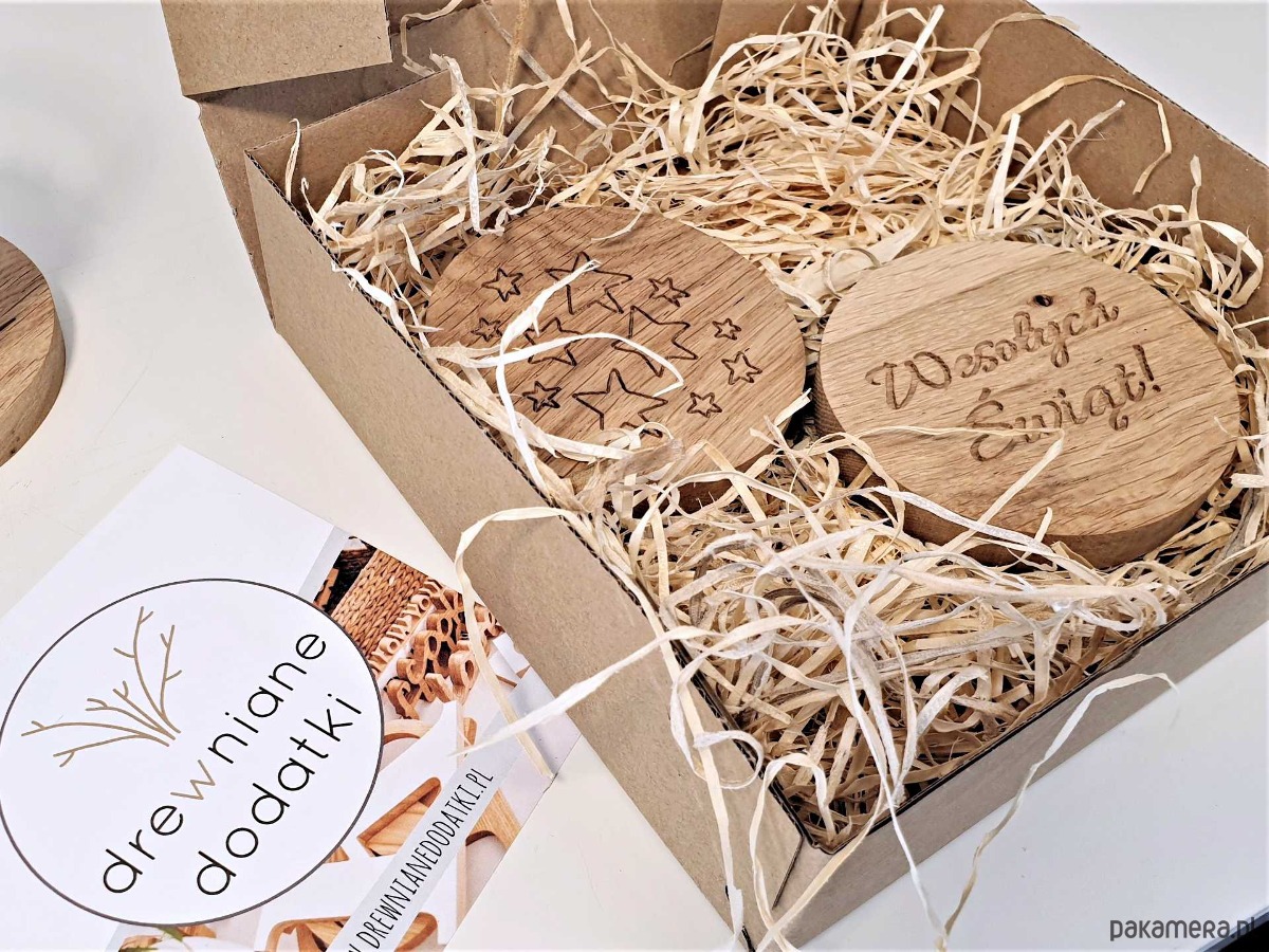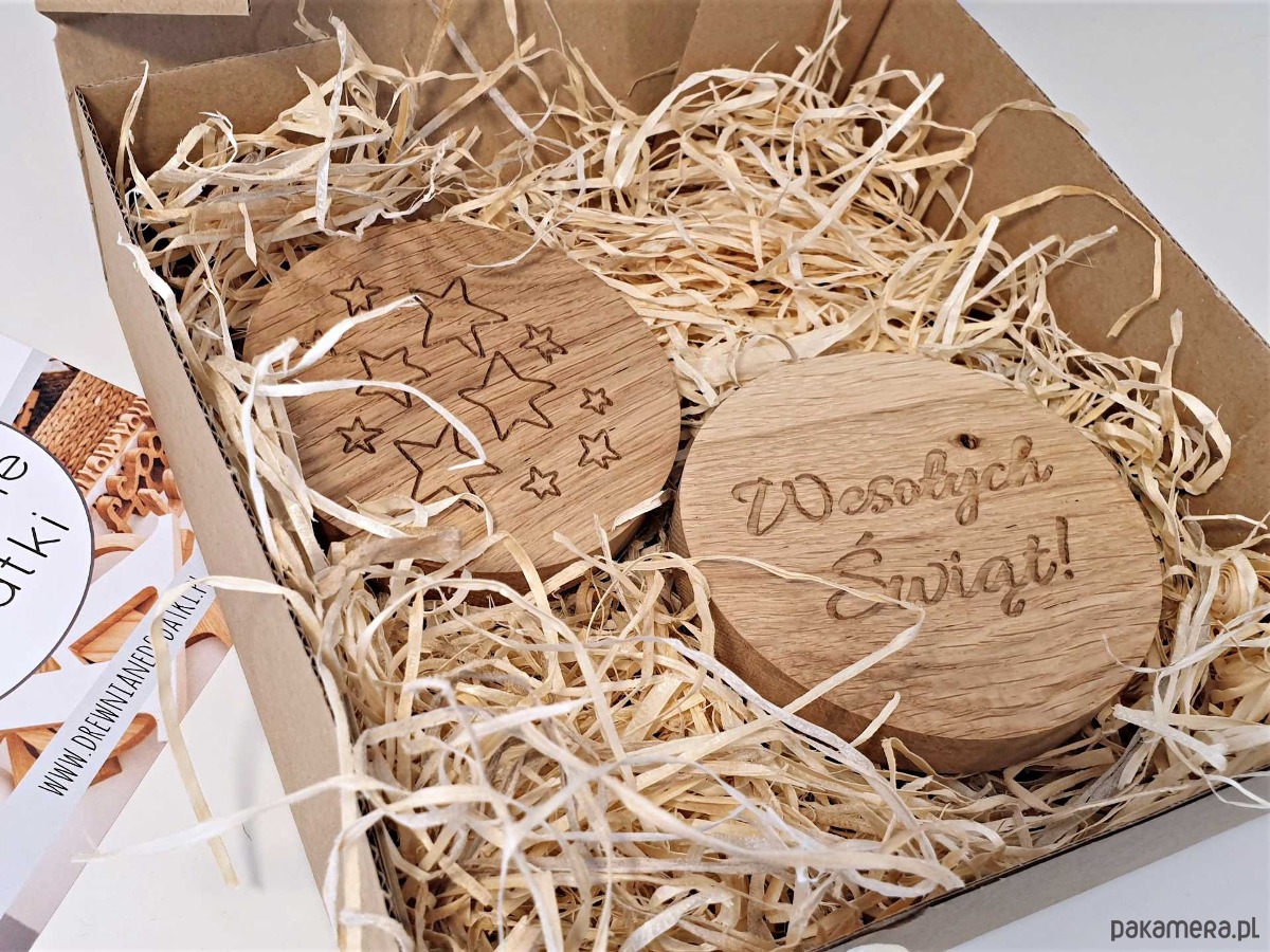 Przepiękne i praktyczne, idealne na prezent - podstawki pod kubek, wykonane jak zawsze u nas - w całości z litego drewna. W tym przypadku z tego, uznawanego za najszlachetniejszy gatunek - dębu. Podkładki ze świątecznym grawerem, zapakowane w ozdoby kartonik wypełniony naturalną wełną drzewną.