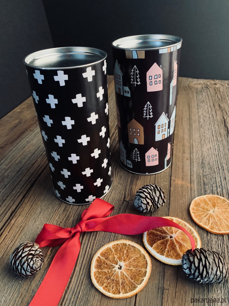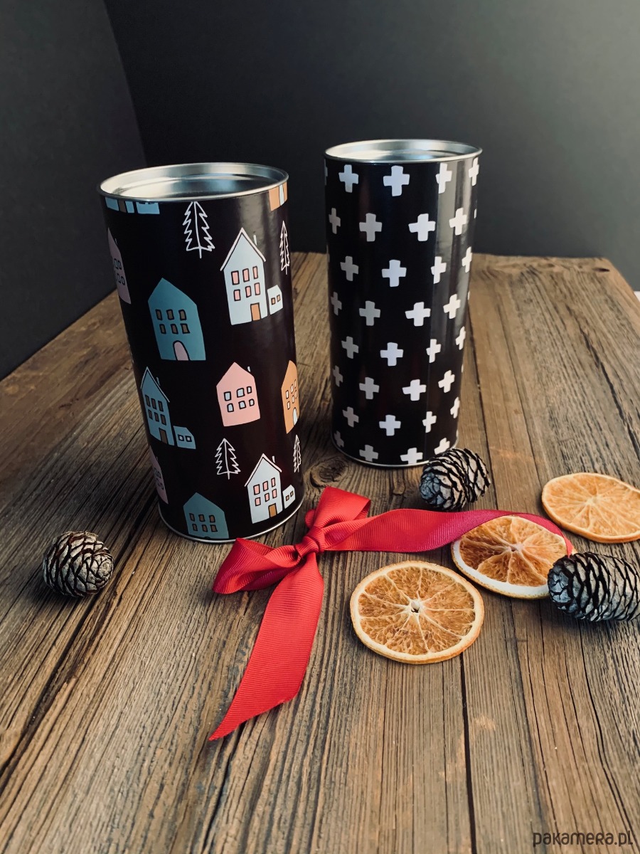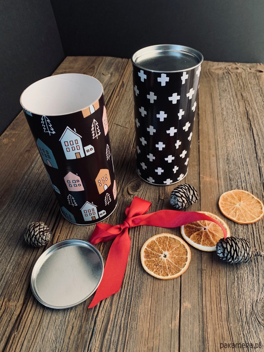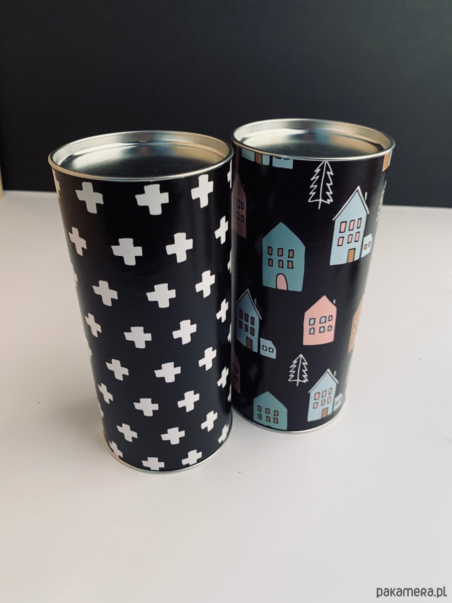 Nasza tuba ma średnicę 82mm, wysokość 180mm, zamknięta jest metalowymi wieczkami które łatwo otworzysz.