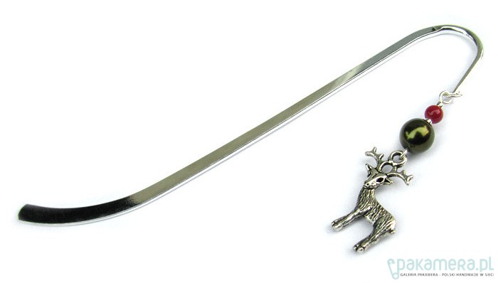 Świąteczno-zimowa zakładka do książki z reniferem :) Wykonana została z elementów pokrytych srebrem, metalu oraz szklanych koralików w zieleni i czerwieni. Całkowita długość zakładki to ok. 12,5 cm, zaś element ozdobny mierzy ok. 4,5 cm.