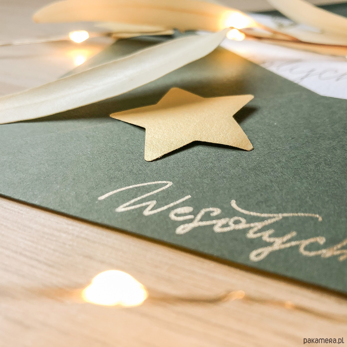 Wysokiej jakości papier o gramaturze 340g, dzięki czemu jest gruby i sztywny. Zdobienia wykonane farbą z pięknym, metalicznym wykończeniem. Pod wpływem światła wszystko mieni się nadając całości prawdziwej magii. Wymiary kartki to 10,5x14,5. Koperta barwiona, formatu C6.