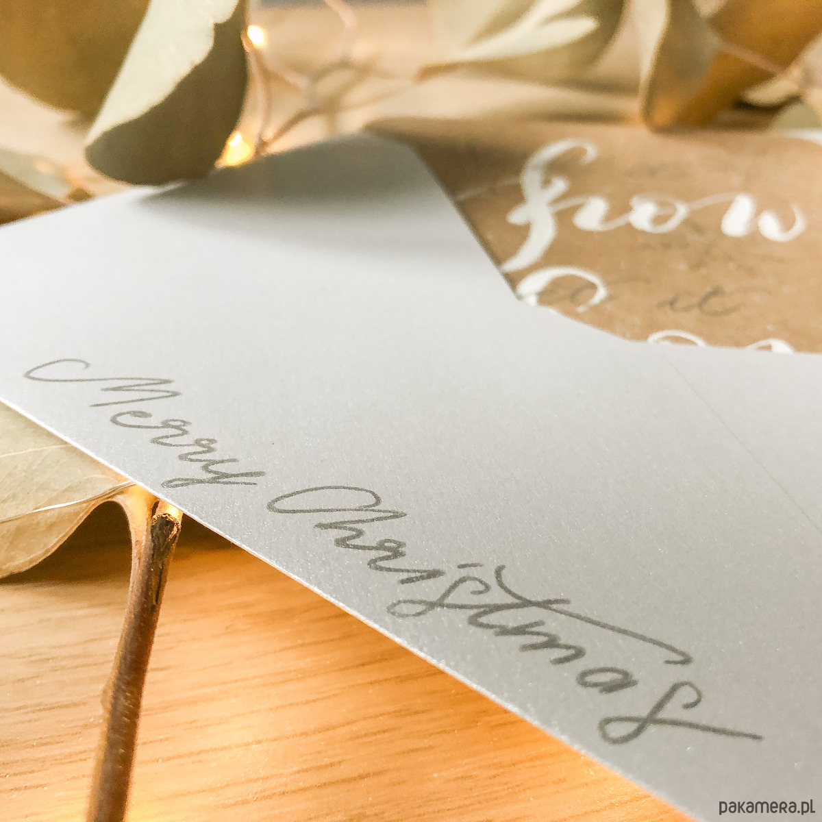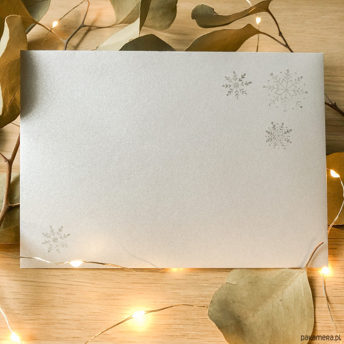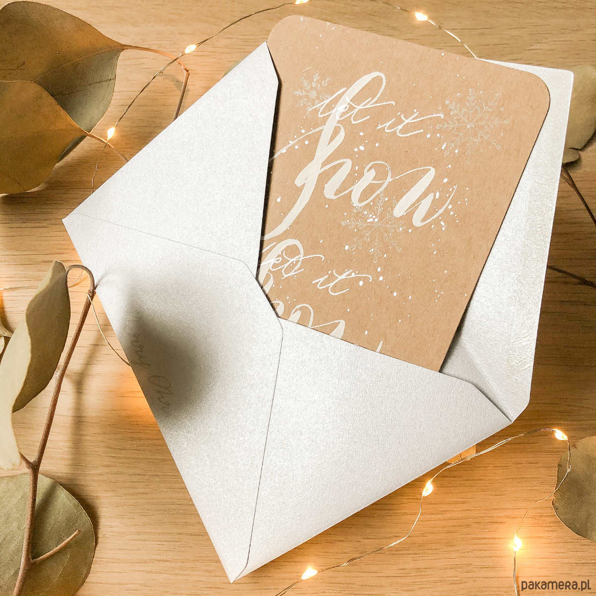 Wysokiej jakości brązowy eko papier o gramaturze 340g, dzięki czemu jest gruby i sztywny. Zdobienia wykonane farbą z pięknym, metalicznym wykończeniem oraz białym tuszem. Pod wpływem światła wszystko mieni się nadając całości prawdziwej magii. Wymiary kartki to 10,5x14,5. Koperta barwiona, formatu C6.
