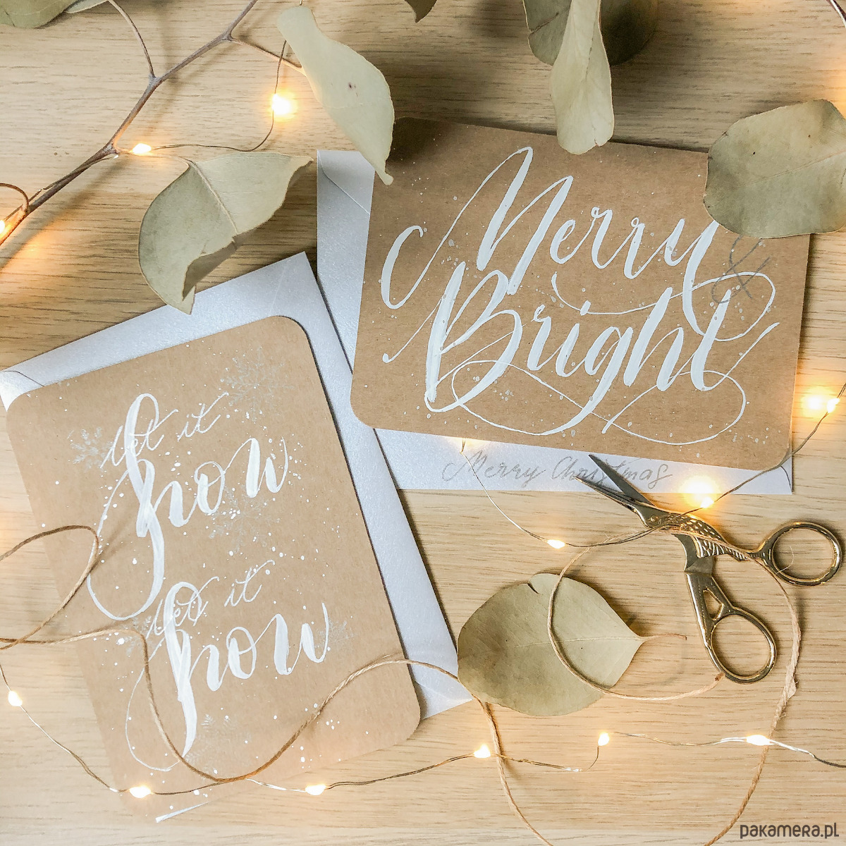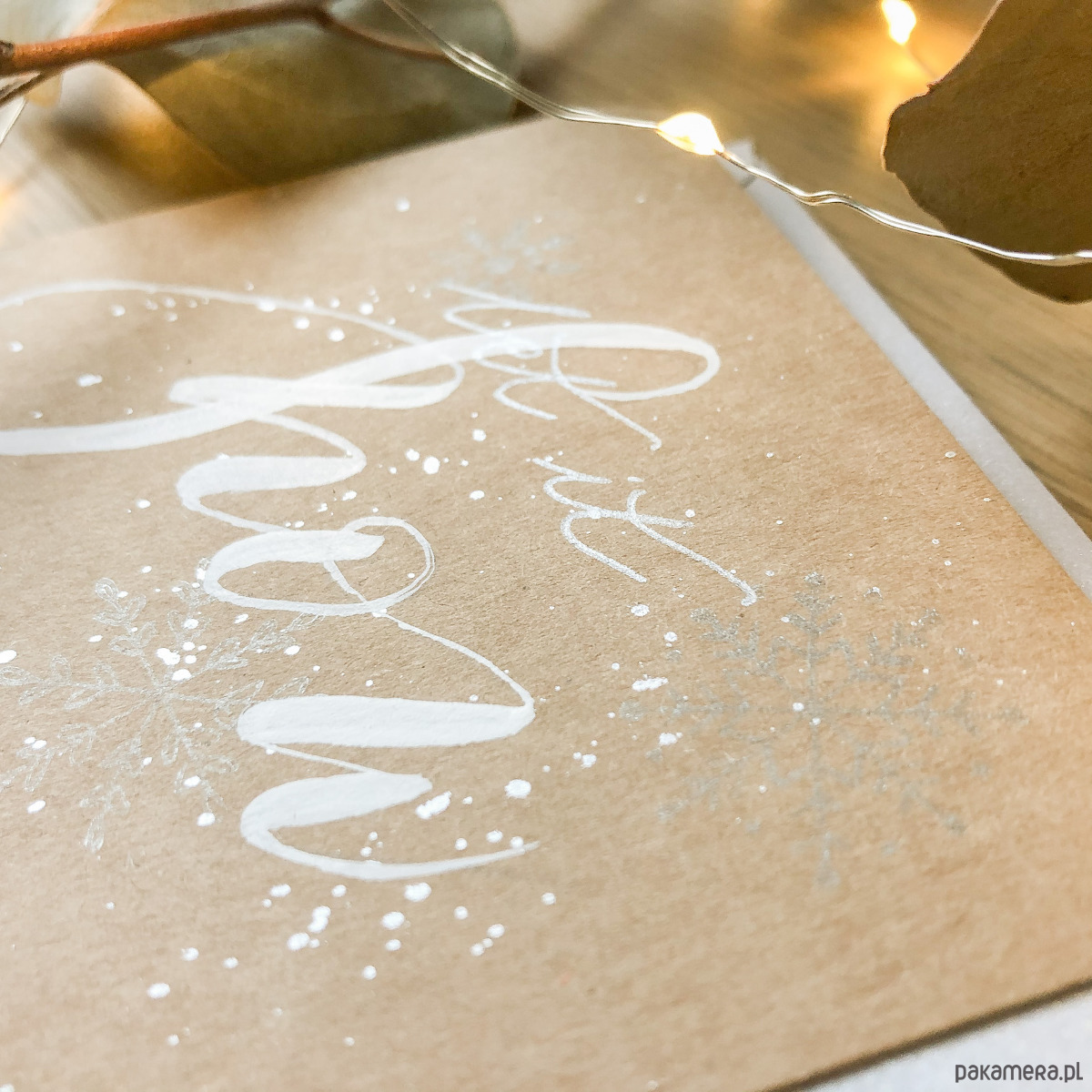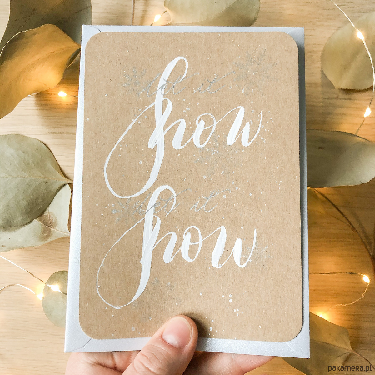 Wysokiej jakości brązowy eko papier o gramaturze 340g, dzięki czemu jest gruby i sztywny. Zdobienia wykonane farbą z pięknym, metalicznym wykończeniem oraz białym tuszem. Pod wpływem światła wszystko mieni się nadając całości prawdziwej magii. Wymiary kartki to 10,5x14,5. Koperta barwiona, formatu C6.