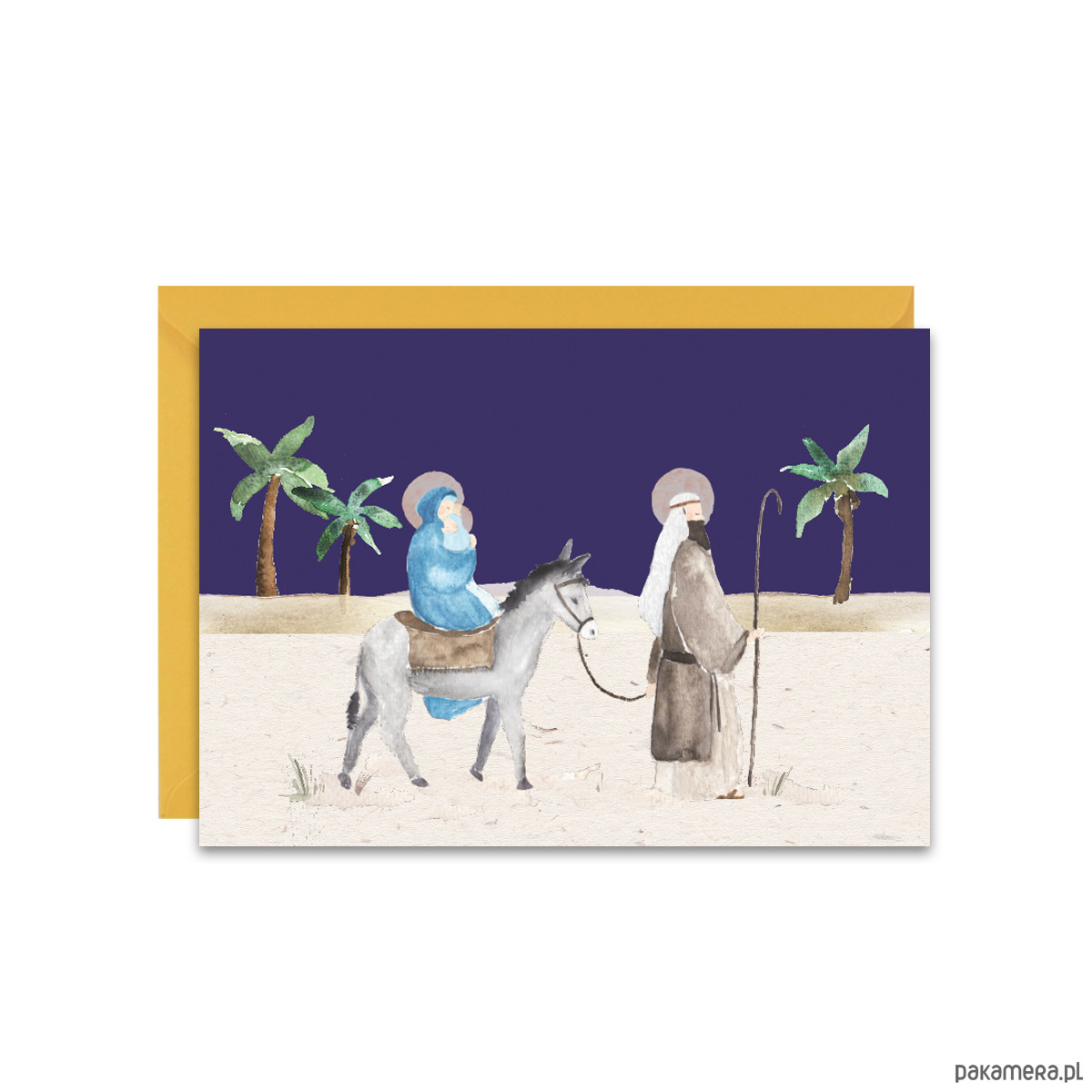 Kartka świąteczna na Boże Narodzenie z akwarelową Świętą Rodziną uciekającą do Egiptu. Doskonała na życzenia dla bliskich, współpracowników, klientów, kontrahentów. Potrzebujesz więcej kart? Z logo firmy i treścią życzeń? Napisz!