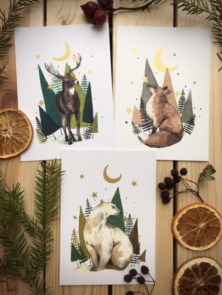 Zestaw 3 kartek świątecznych ze zwierzątkami.