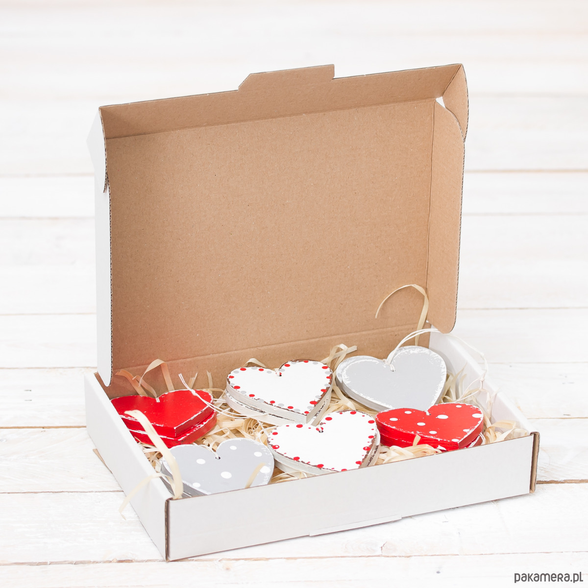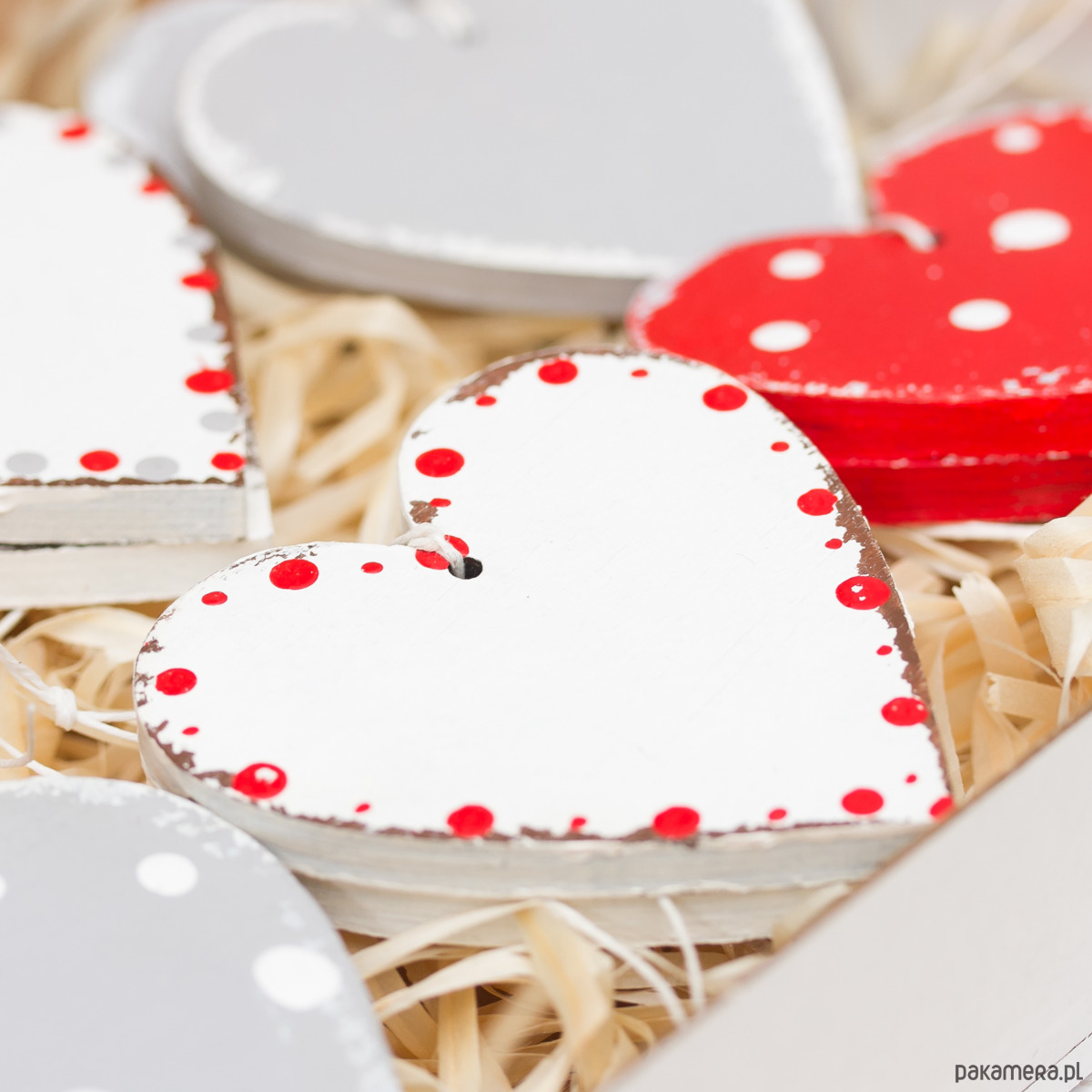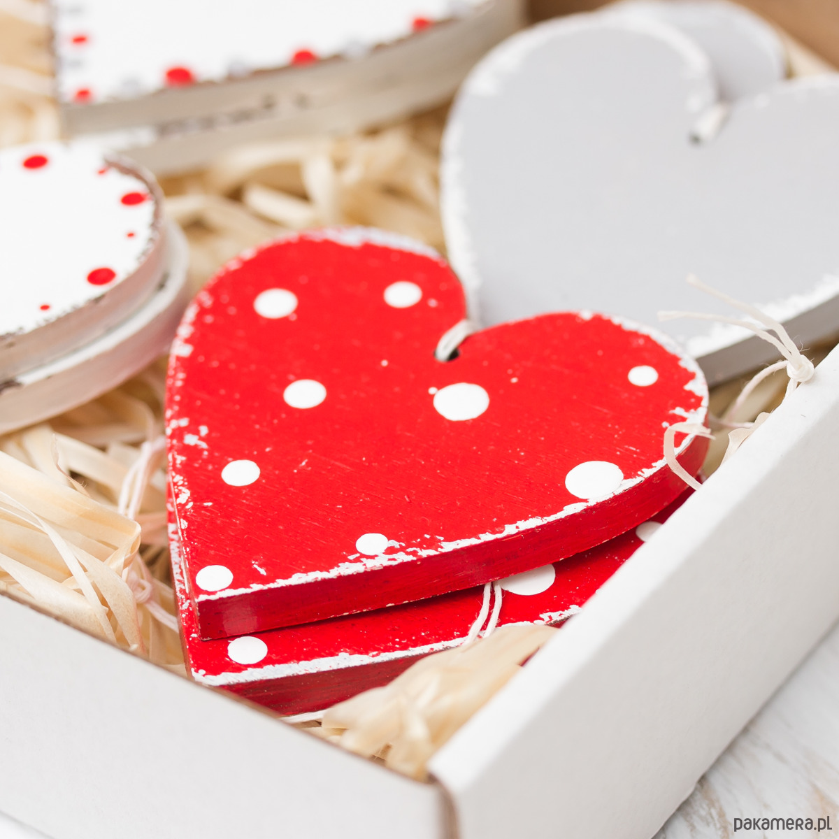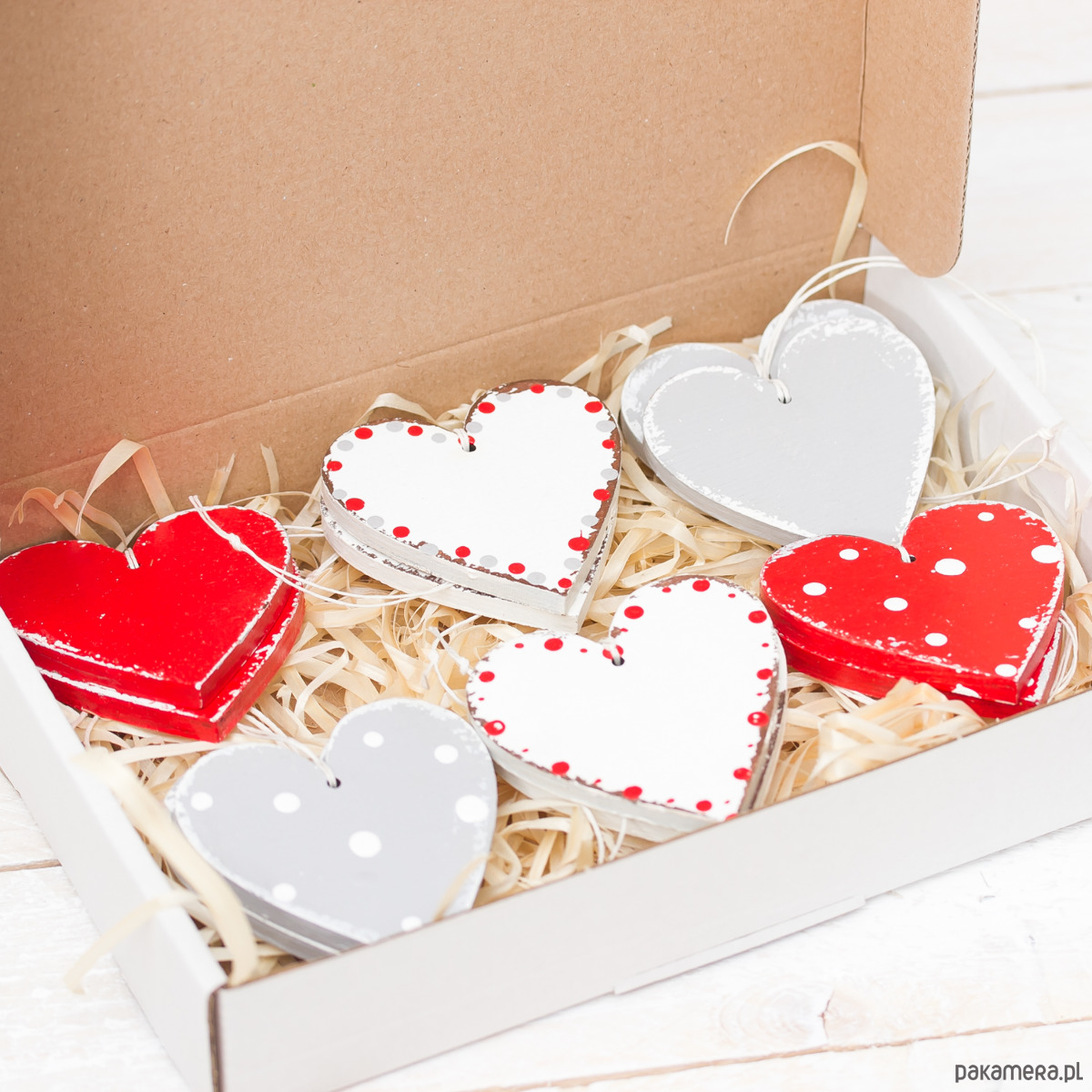 Komplet 12 świątecznych zawieszek w kolorze białym, szarym i czerwonym, zapakowany w tekturowe pudełko przewiązane wstążką. Zawieszki w stylu shabby chic, 7cm, malowane ręcznie. Doskonale sprawdzą się w roli np. w roli dekoracji większych prezentów czy bożonarodzeniowego drzewka.