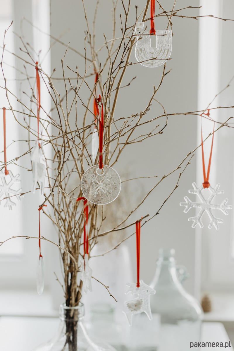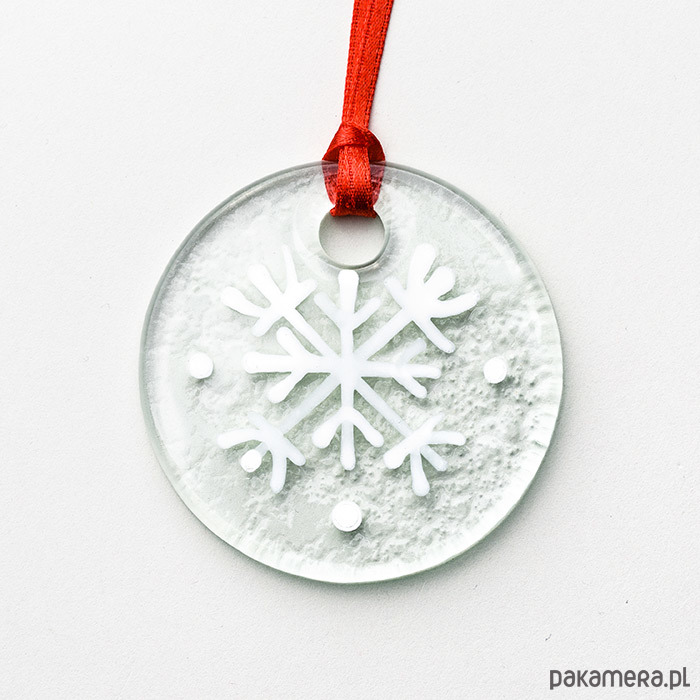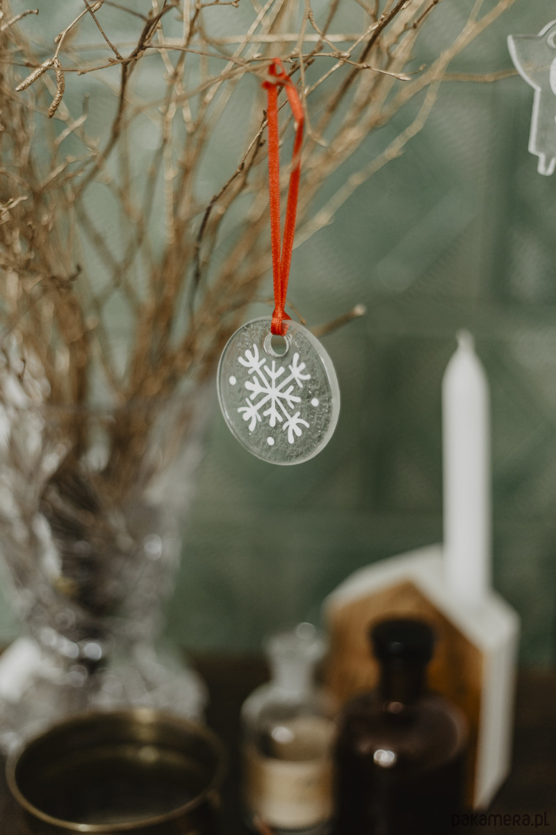 Zestaw czterech autorskich świątecznych zawieszek na choinkę wykonanych ze szkła metodą fusingu. Elementy wykonane ze szkła bezbarwnego z ręcznie malowanym i wypalanym wzorem na powierzchni. Spód szkła posiada delikatną fakturę ciekawie odbijającą światło.