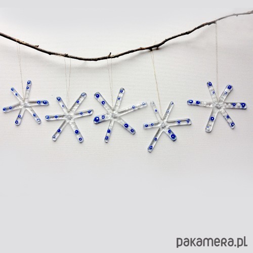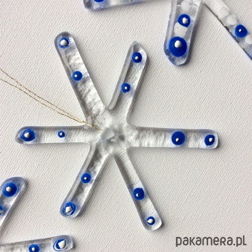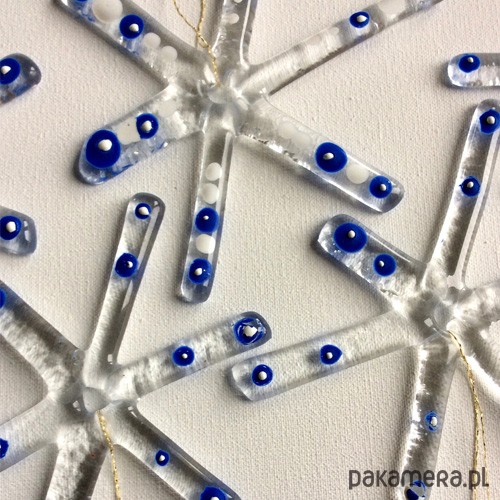 Zestaw szklanych ozdób świątecznych. Gwiazdki zostały wykonane ręcznie, dekorowane malowanym motywem w kolorze błękitnym i białym oraz wypalone w technice fusingu. Uroczo prezentują się na choince lub w oknie, mieniąc się w świetle. Średnica ok. 7 cm Zgodnie z ideą recyklingu wykorzystaliśmy zużyte szkło, nadając mu nową funkcję . Wszystkie ozdoby zostały wykonane ze stłuczki szklanej. Ze względu na ręczne wykonanie otrzymany komplet może nieznacznie różnić się od widocznego na zdjęciach.