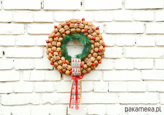 Niepowtarzalny bożonarodzeniowy wianek z orzechów.