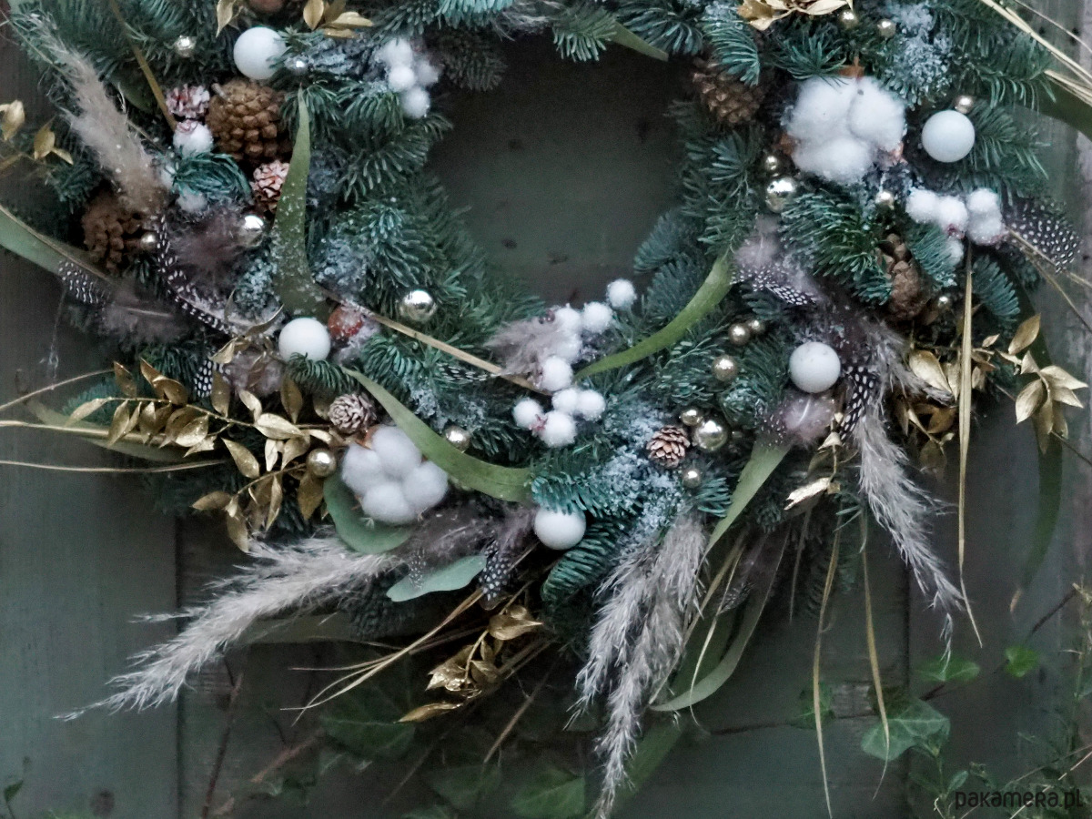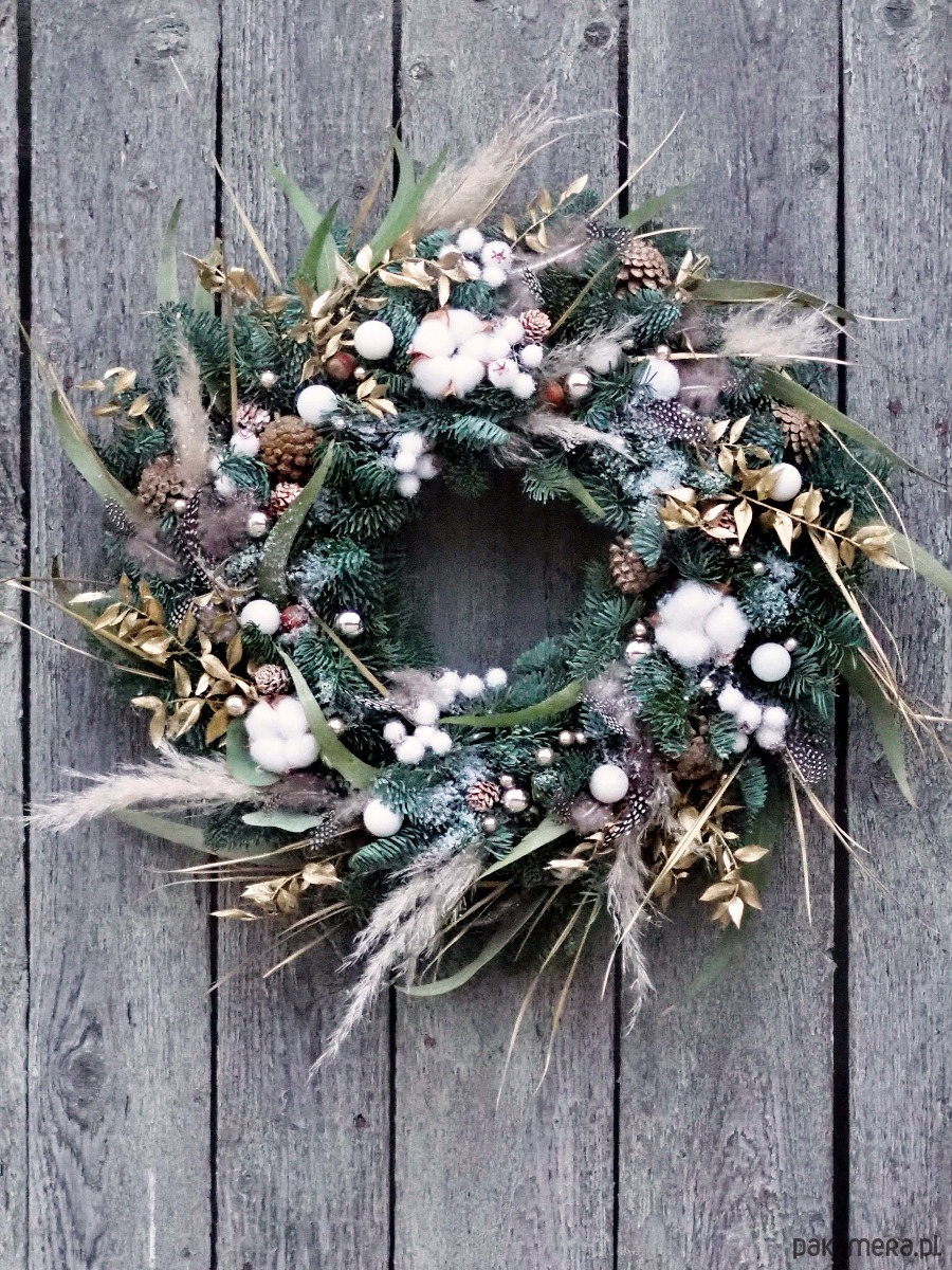 Wianek ozdobiony jest kwiatami bawełny, trawą pampasową, malowanym na złoto ruscusem i eukaliptusem oraz szklanymi bombkami i szyszkami. Piękna dekoracja domu w stylu EKO!