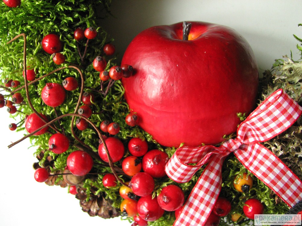 Świąteczny wianek na drzwi wykonany na bazie z brzozowych gałązek,otulony leśnym mchem i dekorowany świątecznymi ozdobami w kolorze czerwieni i pomarańczu.Średnica zewnętrzna ok.28cm. SERDECZNIE ZAPRASZAMY DO ZAKUPU :)