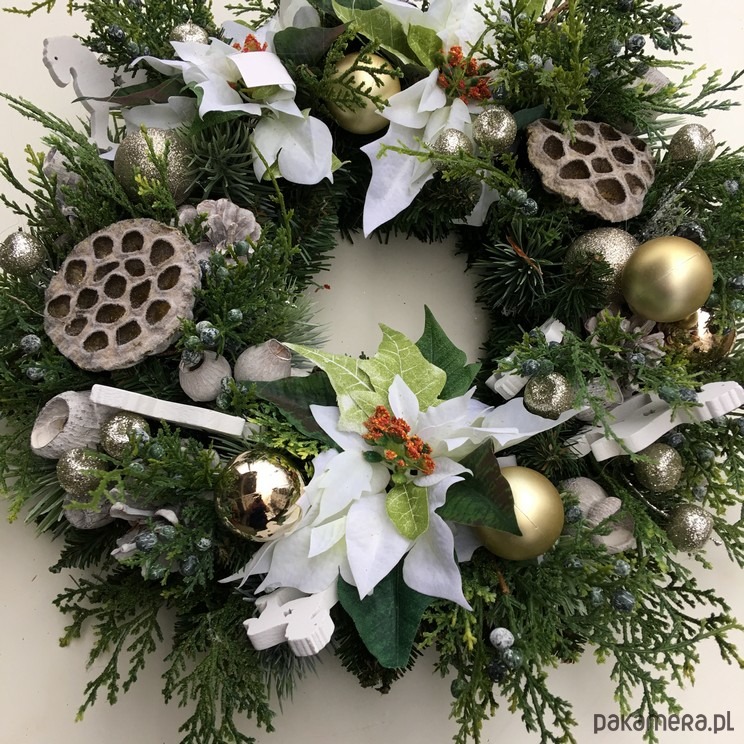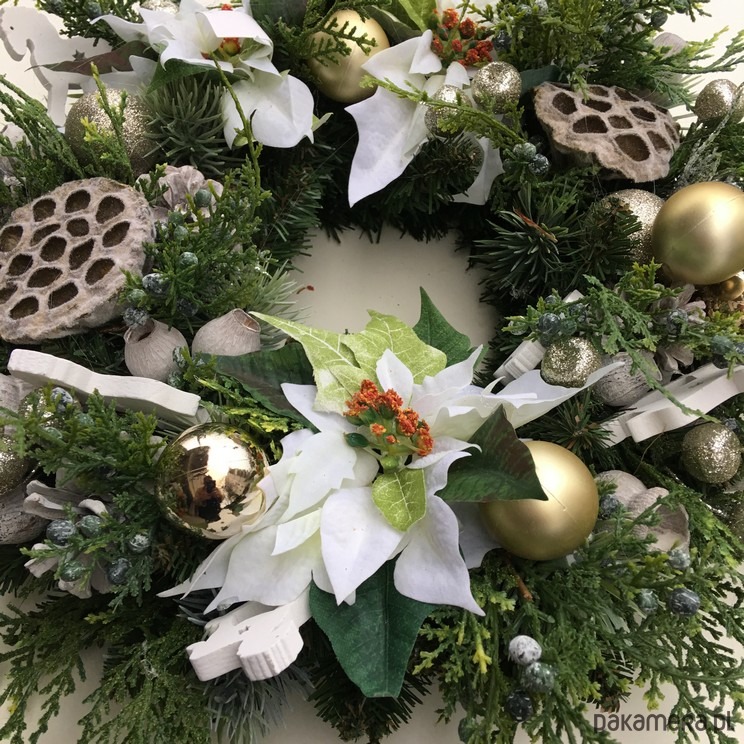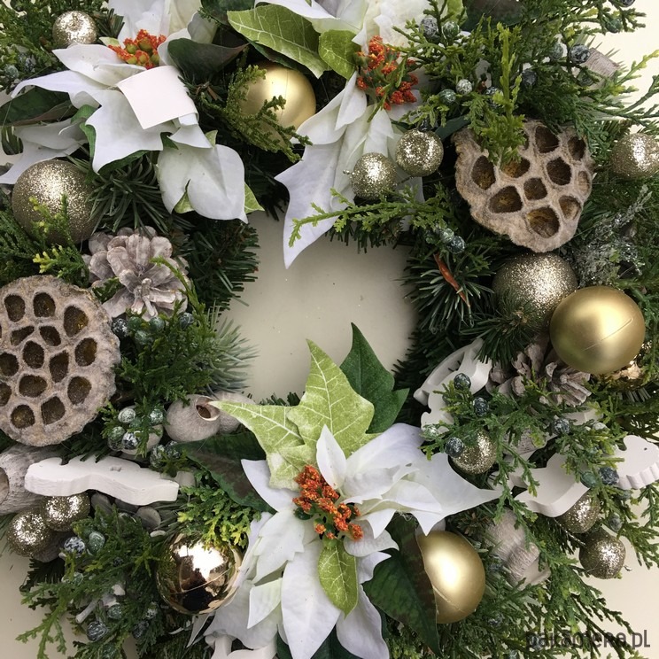Świąteczny wianek w biało-złotej kolorystyce. Wykonany został z wysokiej jakości sztucznych elementów, naturalnych szyszek i tradycyjnych bombek, uzupełnieniem są brokatowe jabłka, drewniane dekoracje i białe gwiazdy betlejemskie. Może być zawieszony lub położony. Wysyłany jest w komplecie z pasującą wstążką. Średnica ok 38 cm. Wianek jest prześliczny - polecamy!