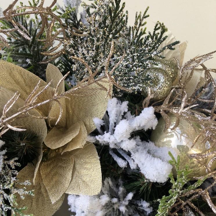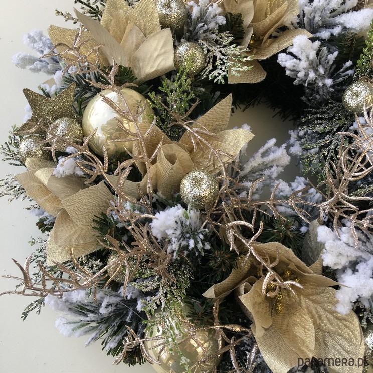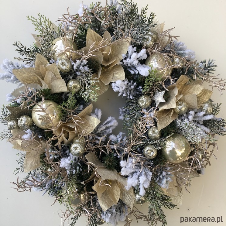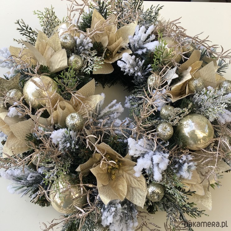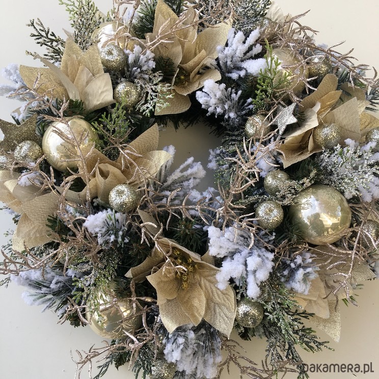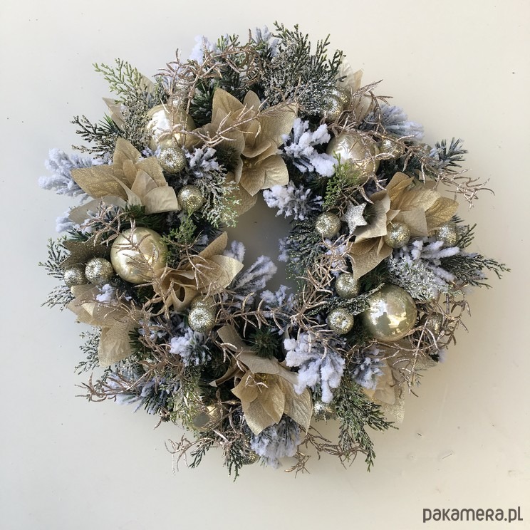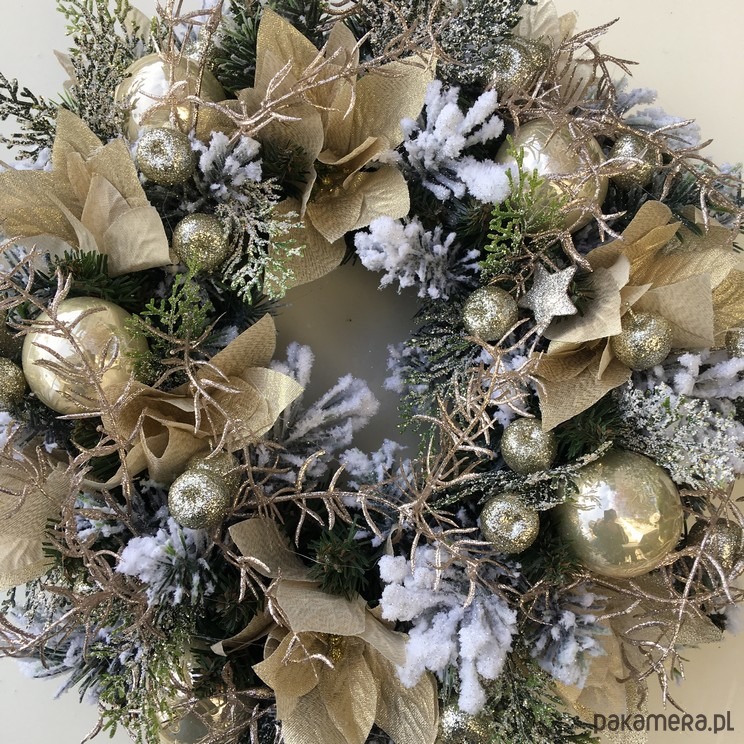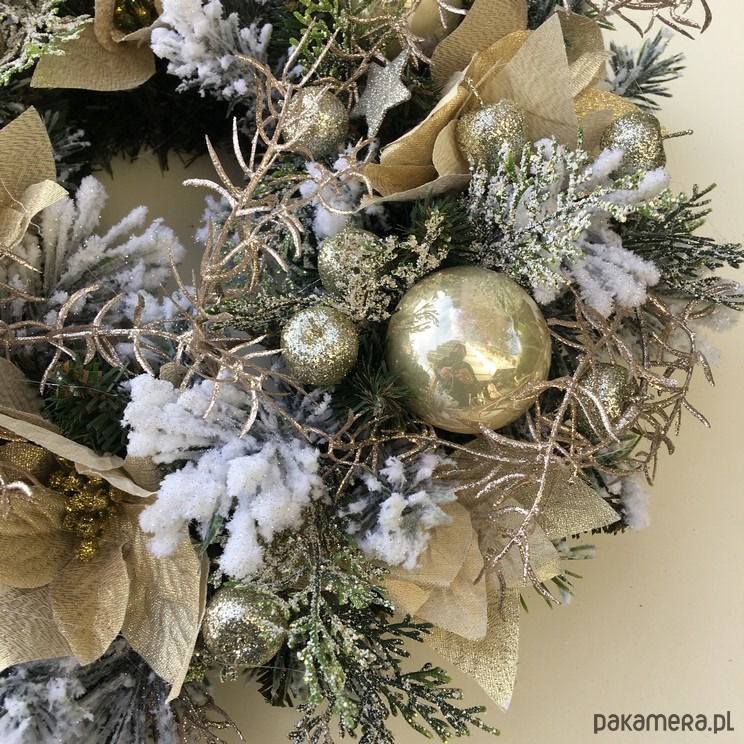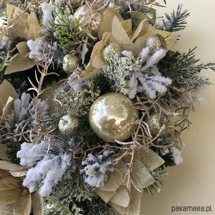 Świąteczny wianek w kolorach delikatnego złota i bieli. Wykonany został z wysokiej jakości sztucznych elementów, naturalnych szyszek i tradycyjnych, szklanych bombek. Może być zawieszony lub położony. Wysyłany jest w komplecie z pasującą wstążką. Średnica ok 35 cm.