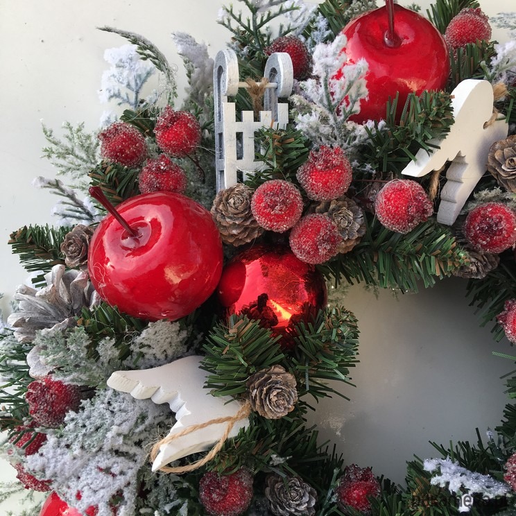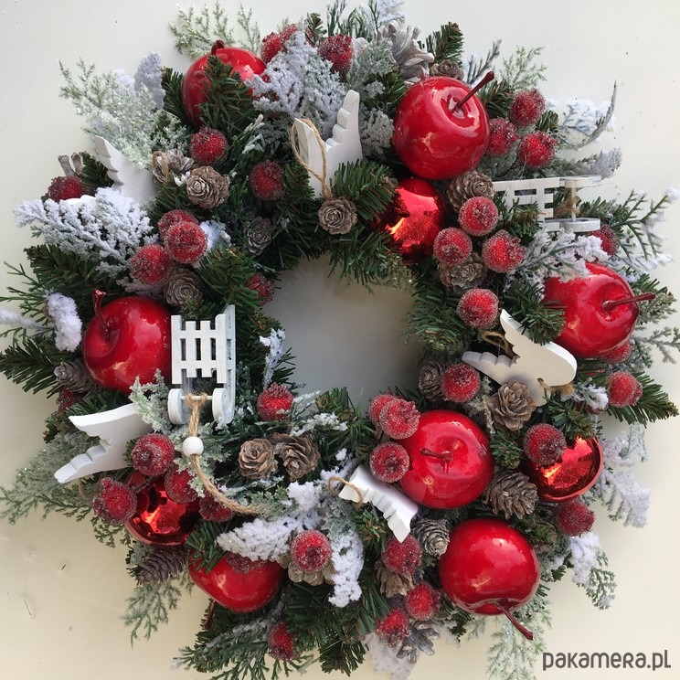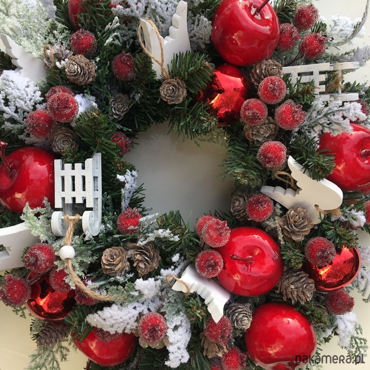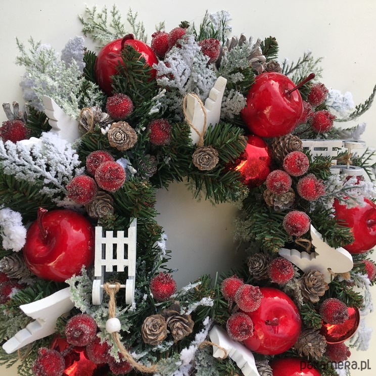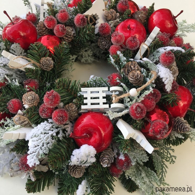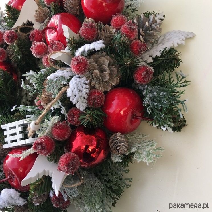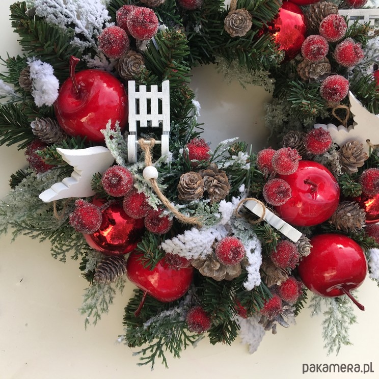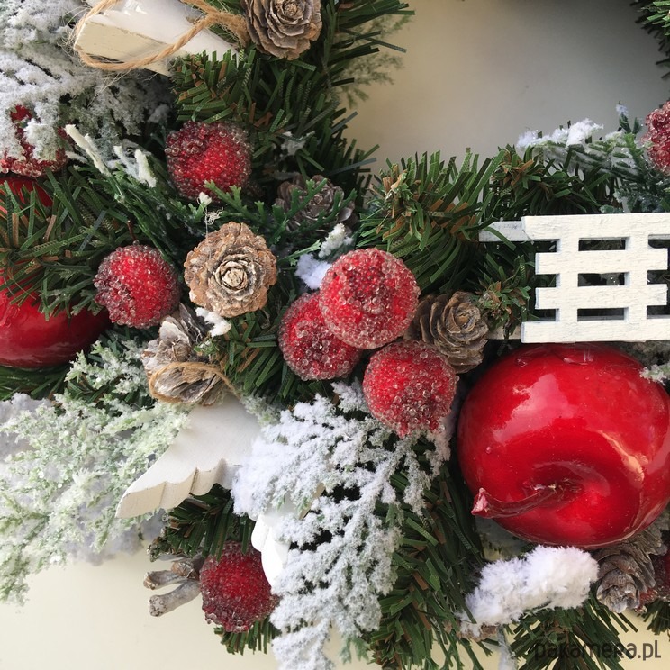 Świąteczny wianek w tradycyjnej kolorystyce. Wykonany został z wysokiej jakości sztucznych elementów, naturalnych szyszek i tradycyjnych bombek, uzupełnieniem są czerwone oszronione jagody i drewniane ozdoby. Może być zawieszony lub położony. Wysyłany jest w komplecie z pasującą wstążką. Średnica ok 40 cm. Wianek jest prześliczny - polecamy!