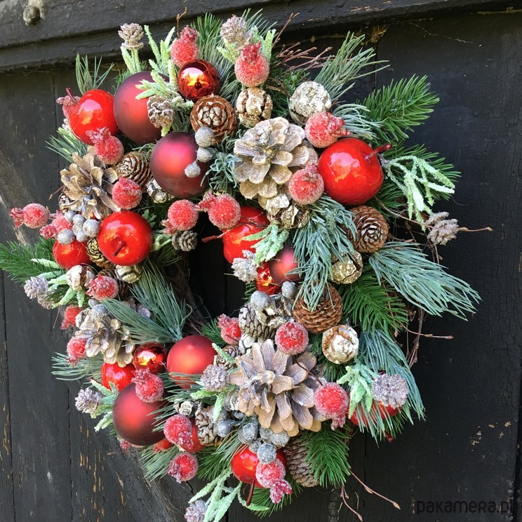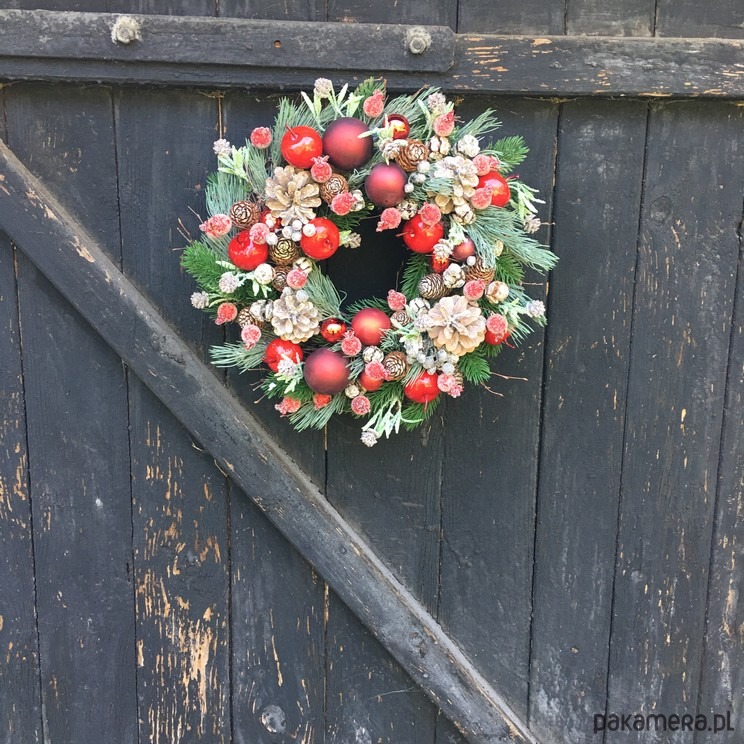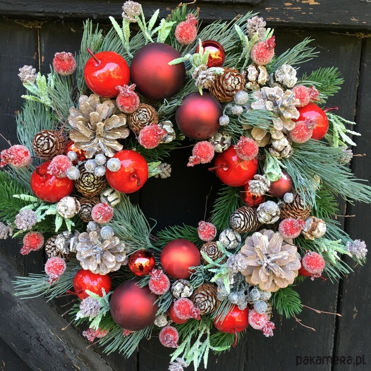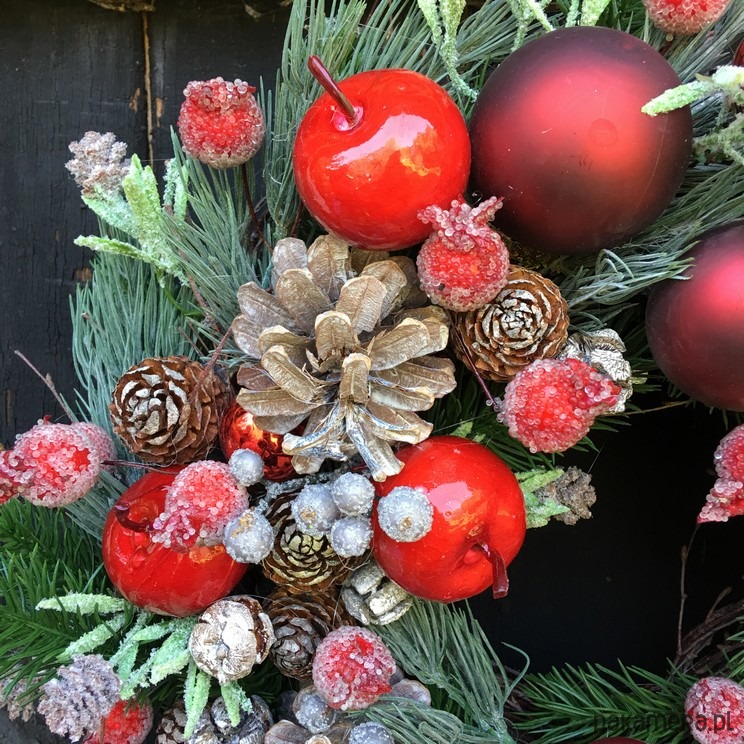 świąteczny wianek w czerwonej kolorystyce. Wykonany został na solidnej bazie plecionej z brzozowych gałązek, dominują w nim elementy naturalne ze świątecznym akcentem w postaci bombek i sztucznych jabłuszek. Będzie wspaniałą ozdobą zarówno na drzwi wejściowe, ścianę jak i na świąteczny stół. Średnica ok 40 cm.