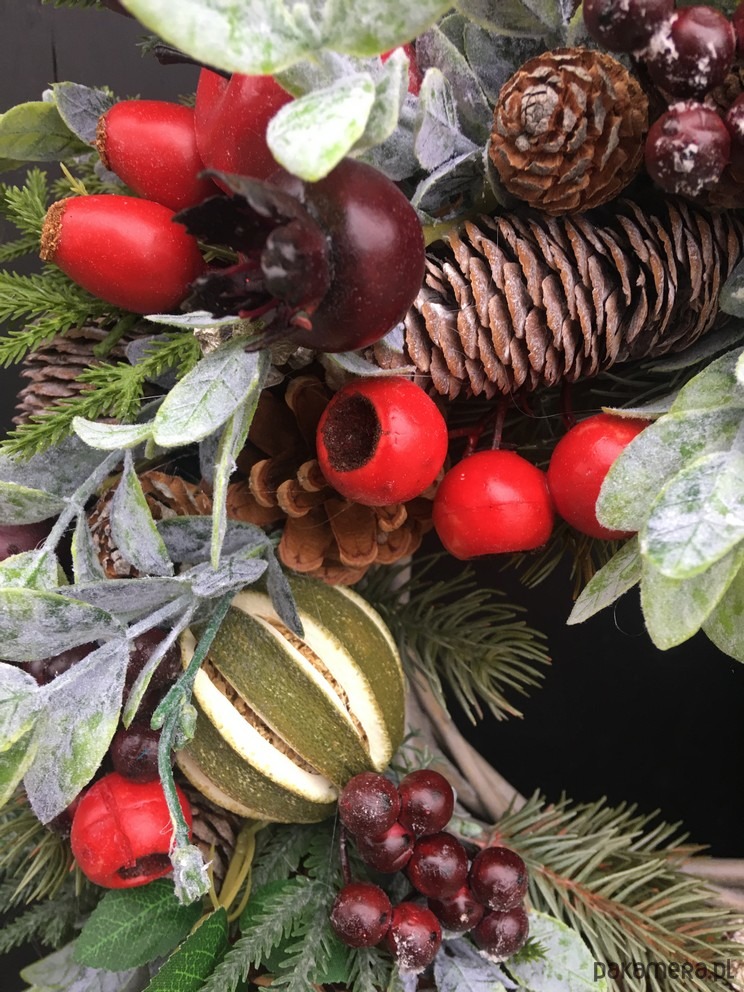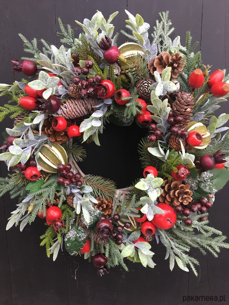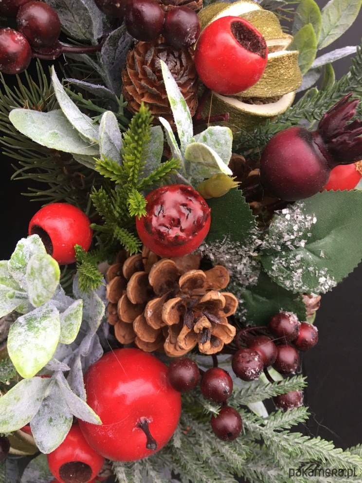 świąteczny wianek w czerwonej kolorystyce. Wykonany został na solidnej bazie plecionej z brzozowych gałązek, dominują w nim elementy naturalne ze świątecznym akcentem w postaci sztucznych jabłuszek i owoców. Będzie wspaniałą ozdobą zarówno na drzwi wejściowe, ścianę jak i na świąteczny stół. Średnica ok 45 cm.