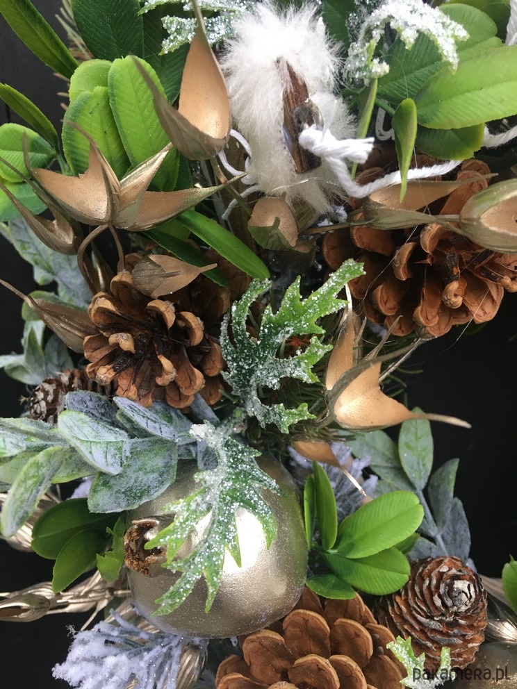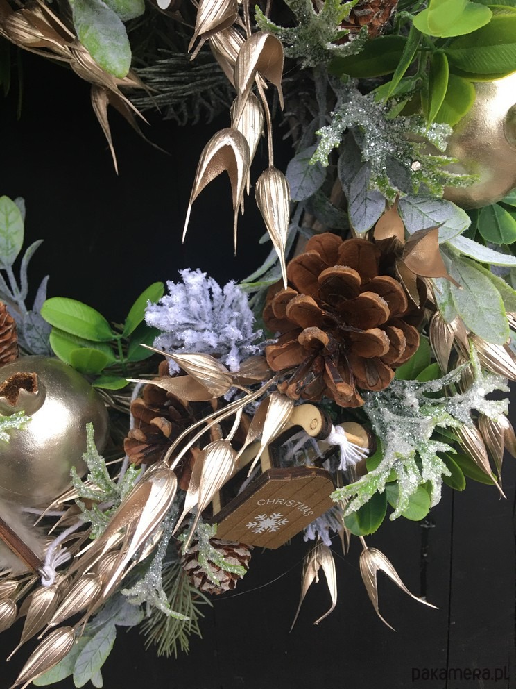 świąteczny wianek w złotej kolorystyce. Wykonany został na bazie ze sztucznych gałązek, wianek jest bogato zdobiony. Będzie wspaniałą ozdobą zarówno na drzwi wejściowe, ścianę jak i na świąteczny stół. Średnica ok 37cm.