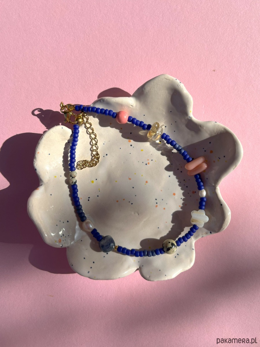 Skład: japońskie koraliki Miyuki, perła słodkowodna, muszla słodkowodna, cytryn, howlit, jaspis dalmatyński, sodalit, hematyt
