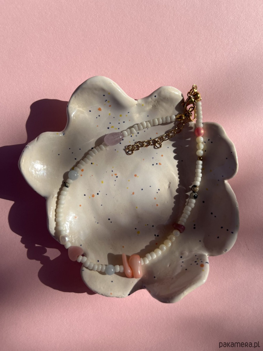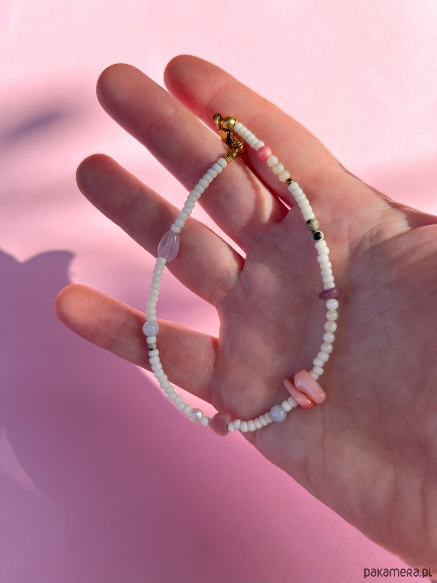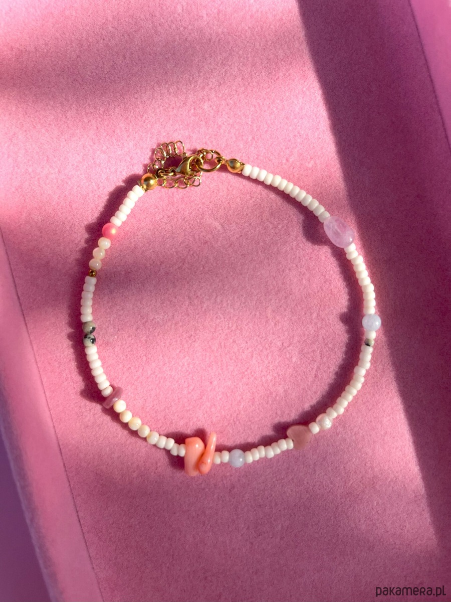 Skład: japońskie koraliki Miyuki, perła słodkowodna, koral, rodonit, kunzyt, masa perłowa, jaspis dalmatyński, hematyt, szkło