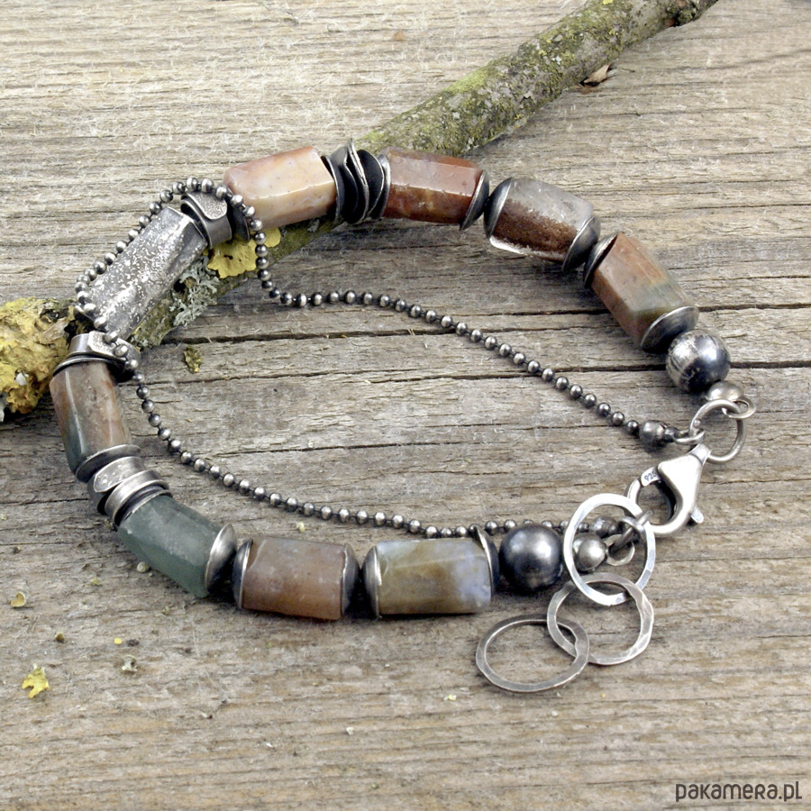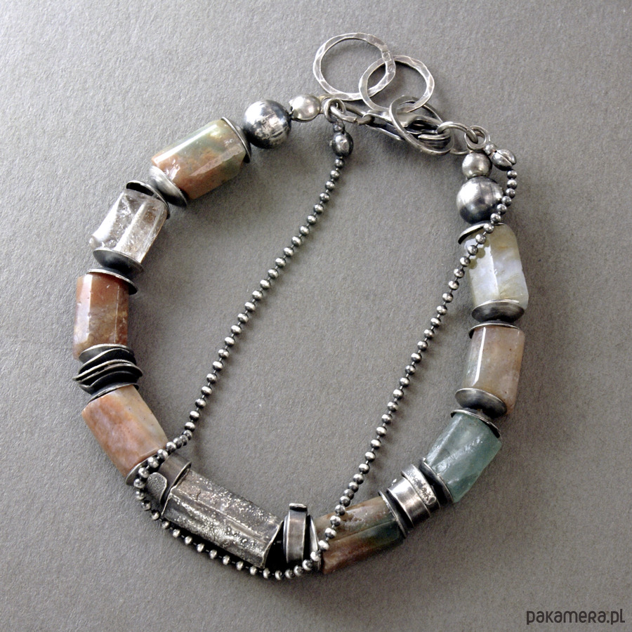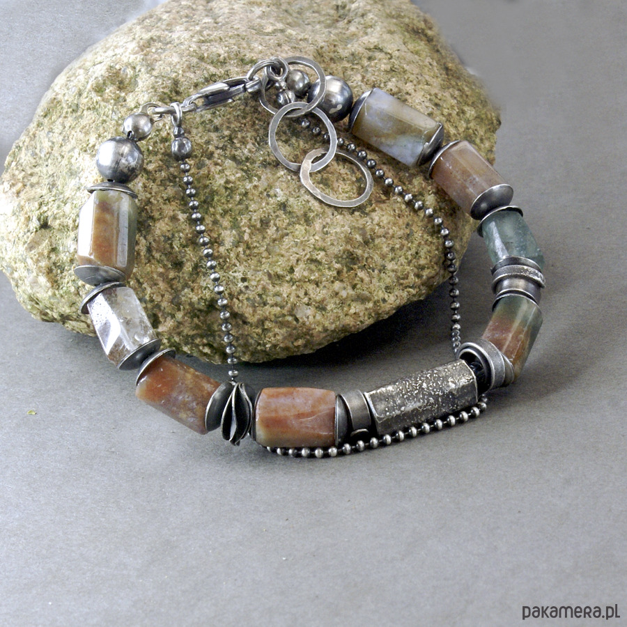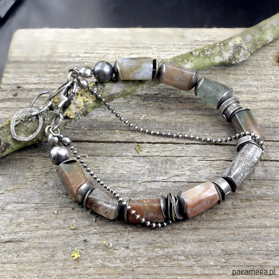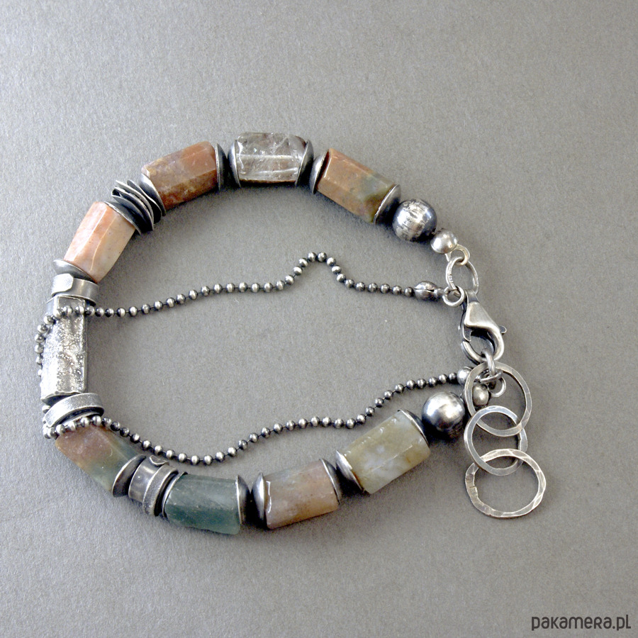 Wielokolorowa bransoletka wykonana ze starannie dobranych kolorystycznie agatów indyjskich, zielonego apatytu, lodolitu i centralnie umieszczonego, ręcznie robionego, kanciastego wałka ze srebra 925. Bransoletkę uzupełnia oksydowany łańcuszek. Kamienie naturalne, różnią się między sobą wielkością i kształtem, posiadają wtrącenia i ryski. Całość wykonana ręcznie, oksydowana i przetarta. Długość bransoletki wynosi ok. 19,5cm, plus przedłużenie do 22cm