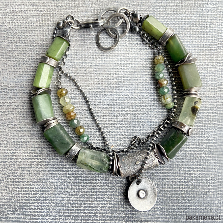Monochromatyczna zielona bransoletka wykonana z nefrytów oraz centralnie umieszczonego, ręcznie robionego, wałka ze srebra 925. Bransoletkę uzupełniają dwa oksydowane łańcuszki z zawieszką. Kamienie naturalne, różnią się między sobą wielkością i kształtem, posiadają wtrącenia i ryski. Całość wykonana ręcznie, oksydowana i przetarta. Długość bransoletki wynosi ok. 19 cm, plus przedłużenie ok. 2,5cm