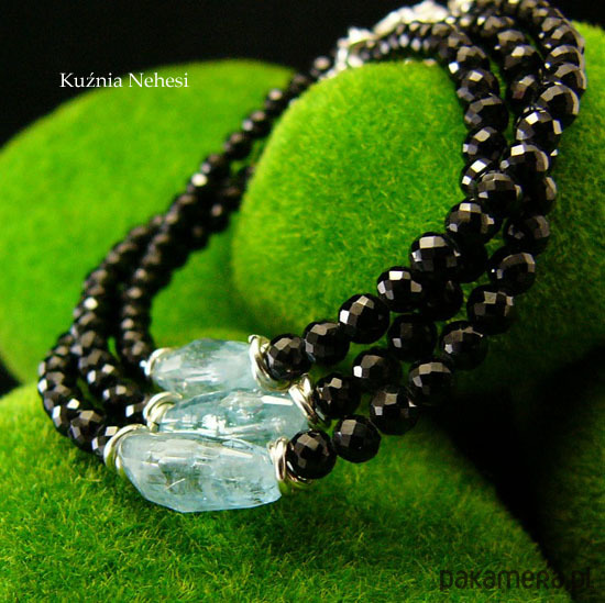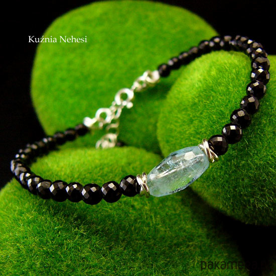 Niezwykła bransoleta wykonana ręcznie ze srebra próby 925 oraz przepięknych mikrofasetowanych naturalnych czarnych Spineli w rozmiarze 4mm oraz nugettu fasetowanego wysokiej klasy przejrzystego Akwamarynu. Bransoleta jest z regulacją, więc pasuje na każdy nadgarstek, mogę ją dopasować specjalnie dla Ciebie. Akwamaryn to kamień ochronny podróżnych. Dobrze wpływa na mózg i intelekt, przynosi spokój, wspomaga skupienie. Spinel jest kamieniem dodającym energii w strefie fizycznej i emocjonalnej. Polecam Nehesi
