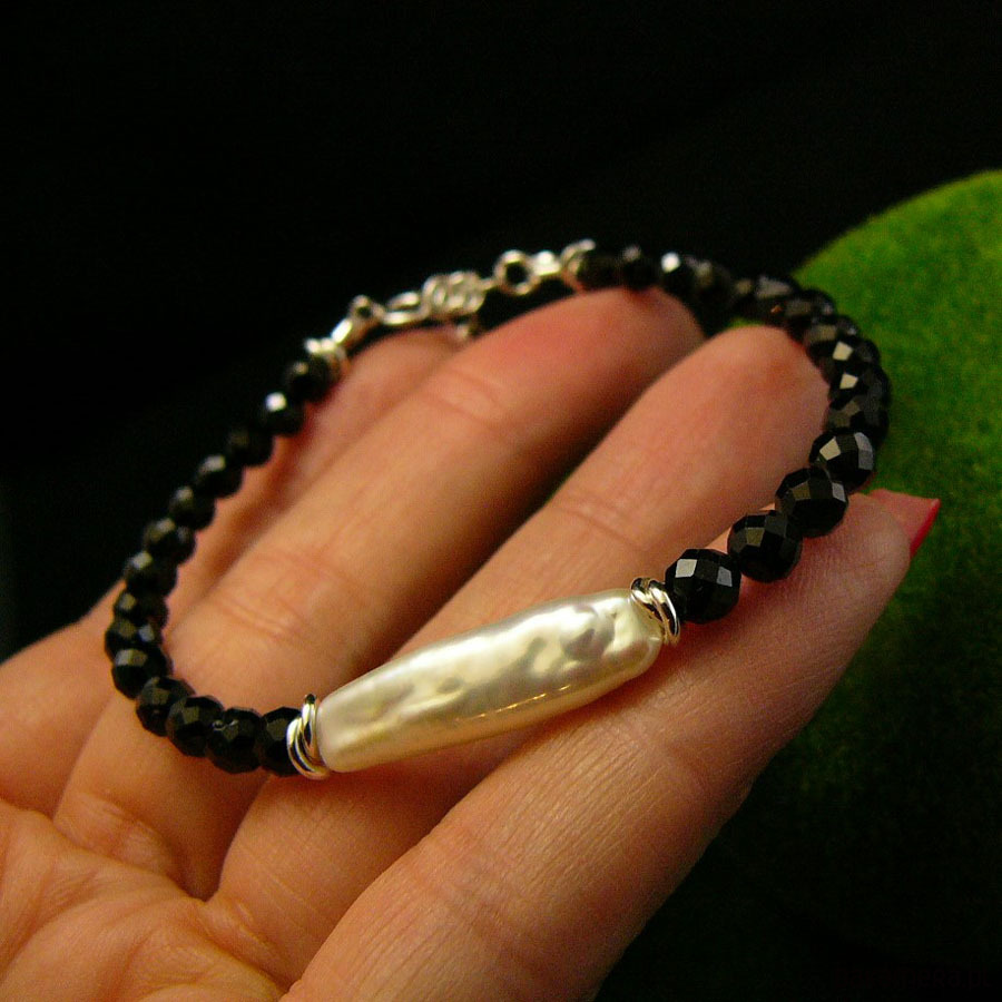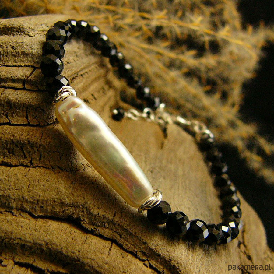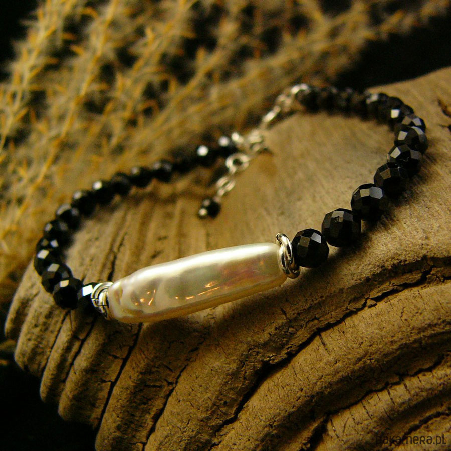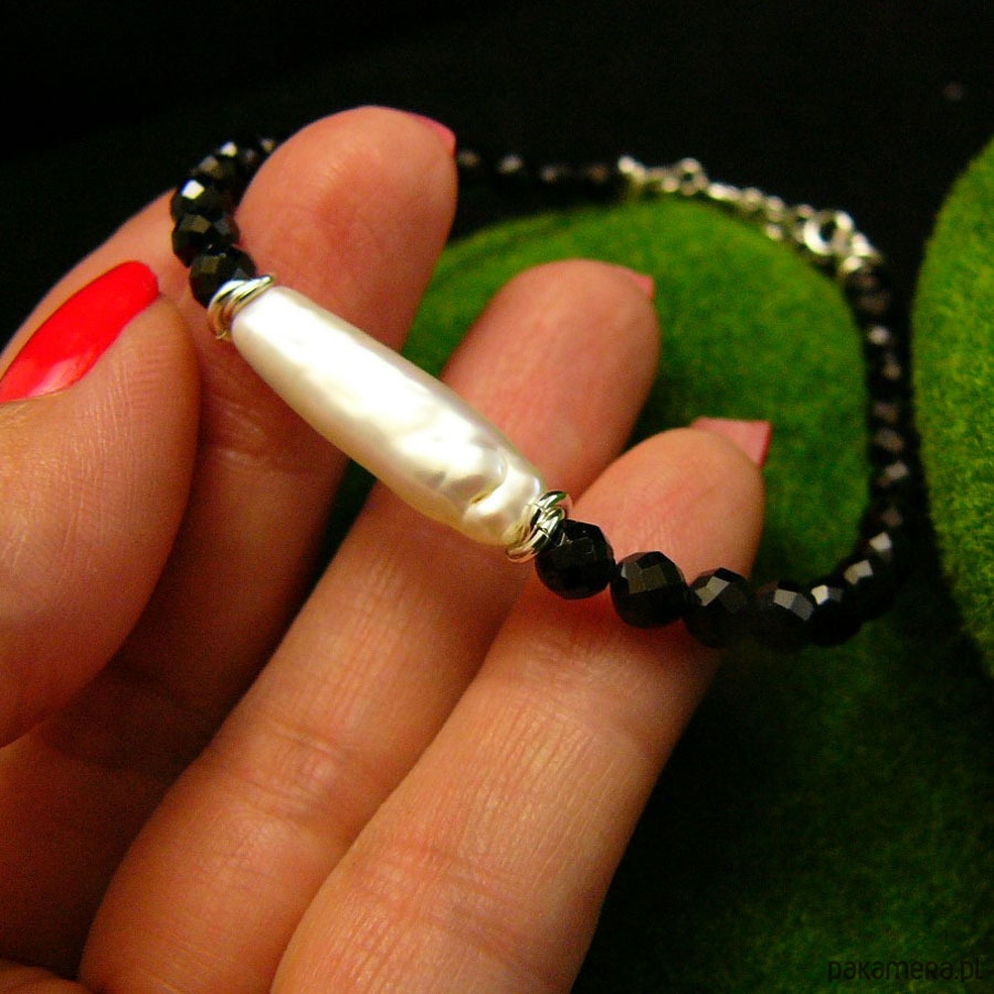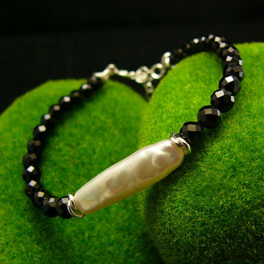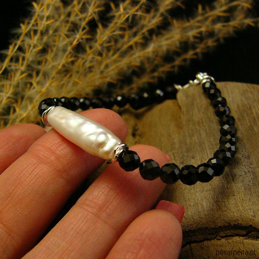 Wyjątkowa bransoleta wykonana ręcznie ze srebra próby 925 oraz naturalnych fasetowanych kulek czarnego Turmalinu oraz naturalną Perłą Keshi. Czarny Turmalin to bardzo silny kamień ochronny, rozprasza lęki, blokuje promieniowanie. Perły wzmacniają intuicję rozwijają wewnetrzną mądrość, symbolizują czystość i harmonię. Bransoleta jest z regulacją, więc pasuje na każdy nadgarstek. Kamienie tworzą z bransolety Amulet ochronny ( turmalin ) oraz Talizman spokoju ( Perła ). Polecam Nehesi