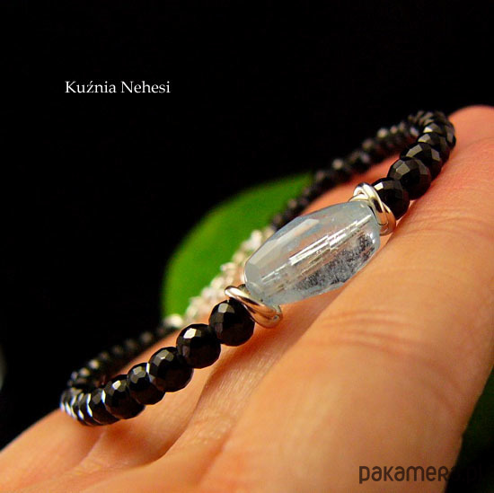 Niezwykła bransoleta wykonana ręcznie ze srebra próby 925 oraz przepięknych mikrofasetowanych naturalnych czarnych Spineli w rozmiarze 4mm oraz nugettu fasetowanego wysokiej klasy przejrzystego Akwamarynu. Bransoleta jest z regulacją, więc pasuje na każdy nadgarstek, mogę ją dopasować specjalnie dla Ciebie. Polecam Nehesi