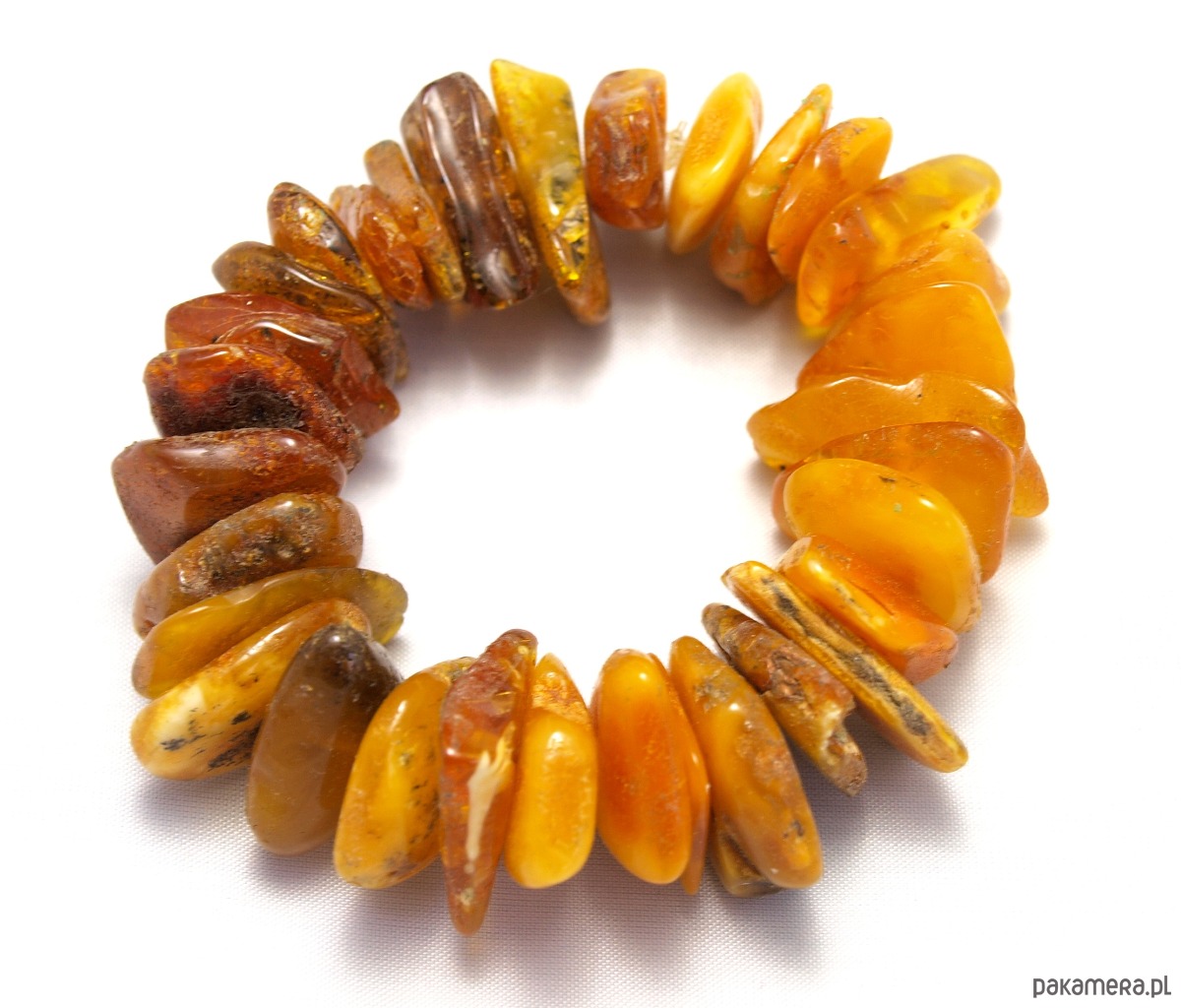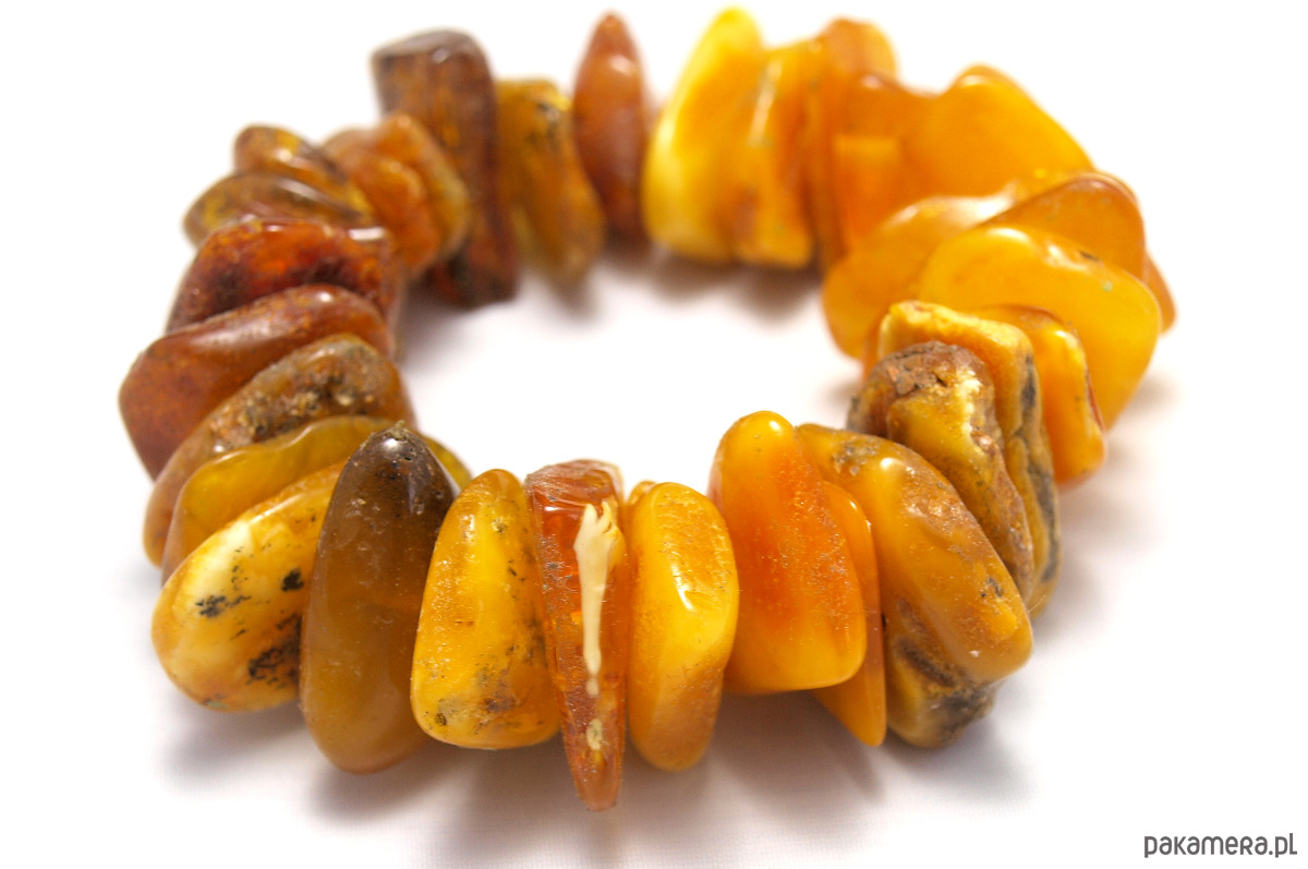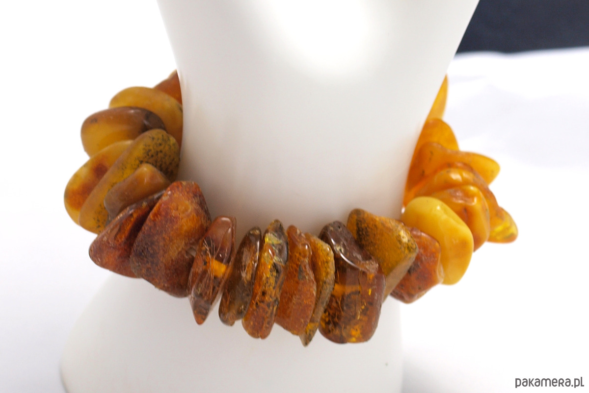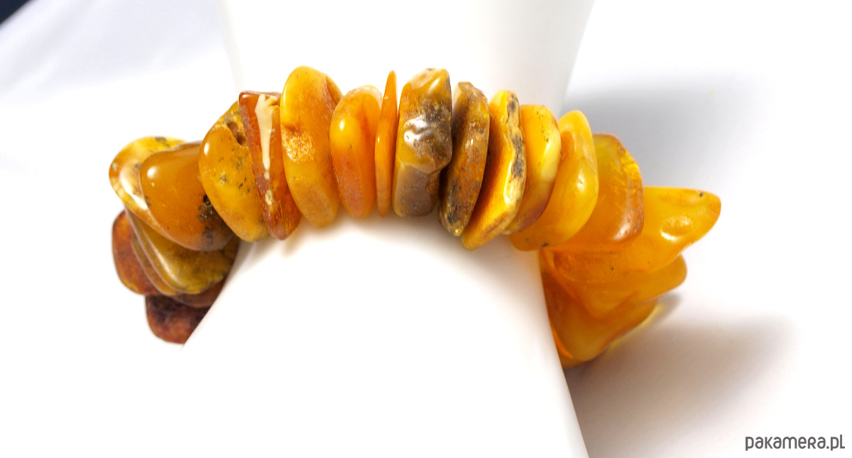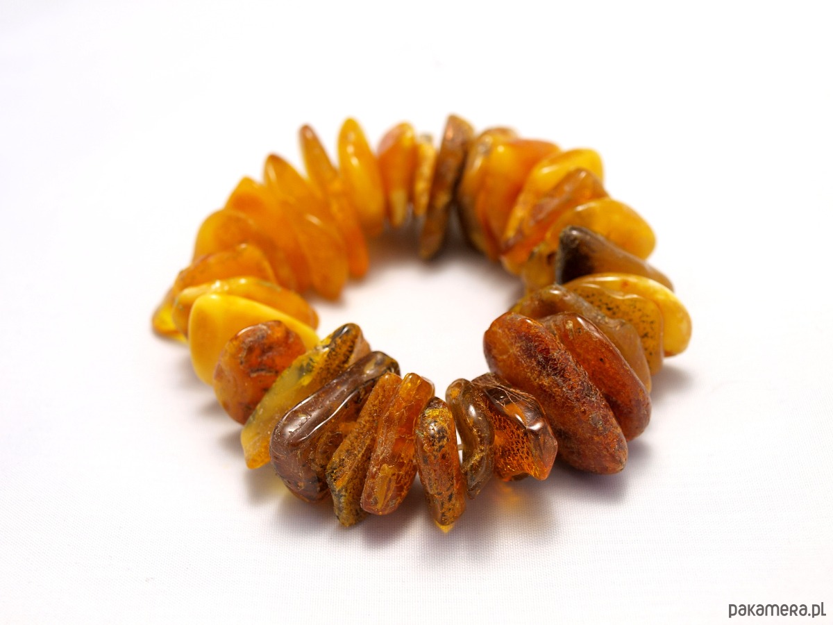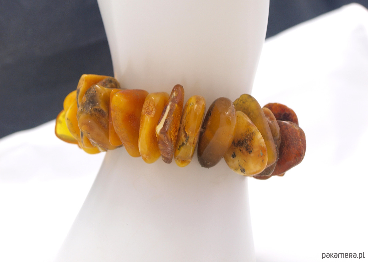 Ręcznie wykonana bransoleta z bałtyckiego naturalnego bursztynu. Kawałki bursztynu umieszczono na elastycznej gumce, dzięki czemu bransoleta dopasuje się do większości rąk.