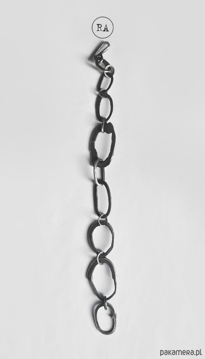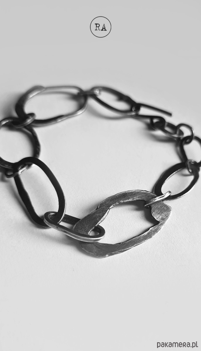 Bransoleta ze srebra, oksydowana, ręcznie kuta.