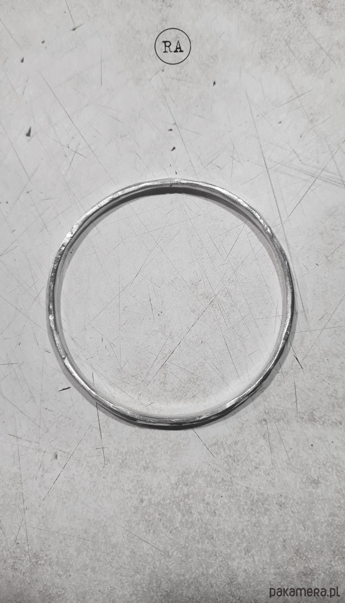 Bransoleta wykonana ze srebra, ręcznie kuta, nierówna, młotkowana.