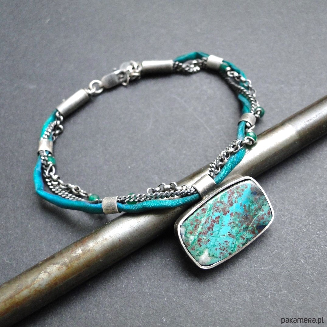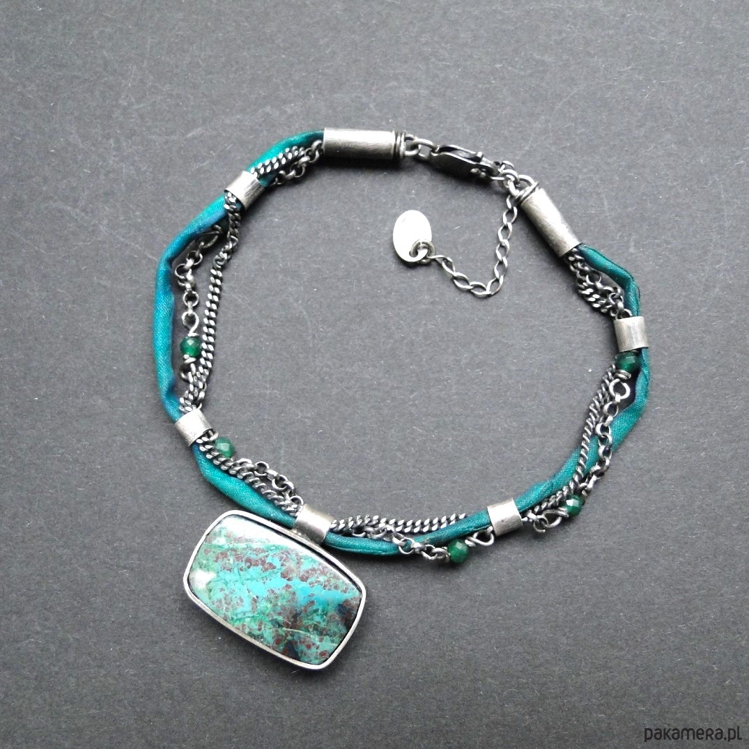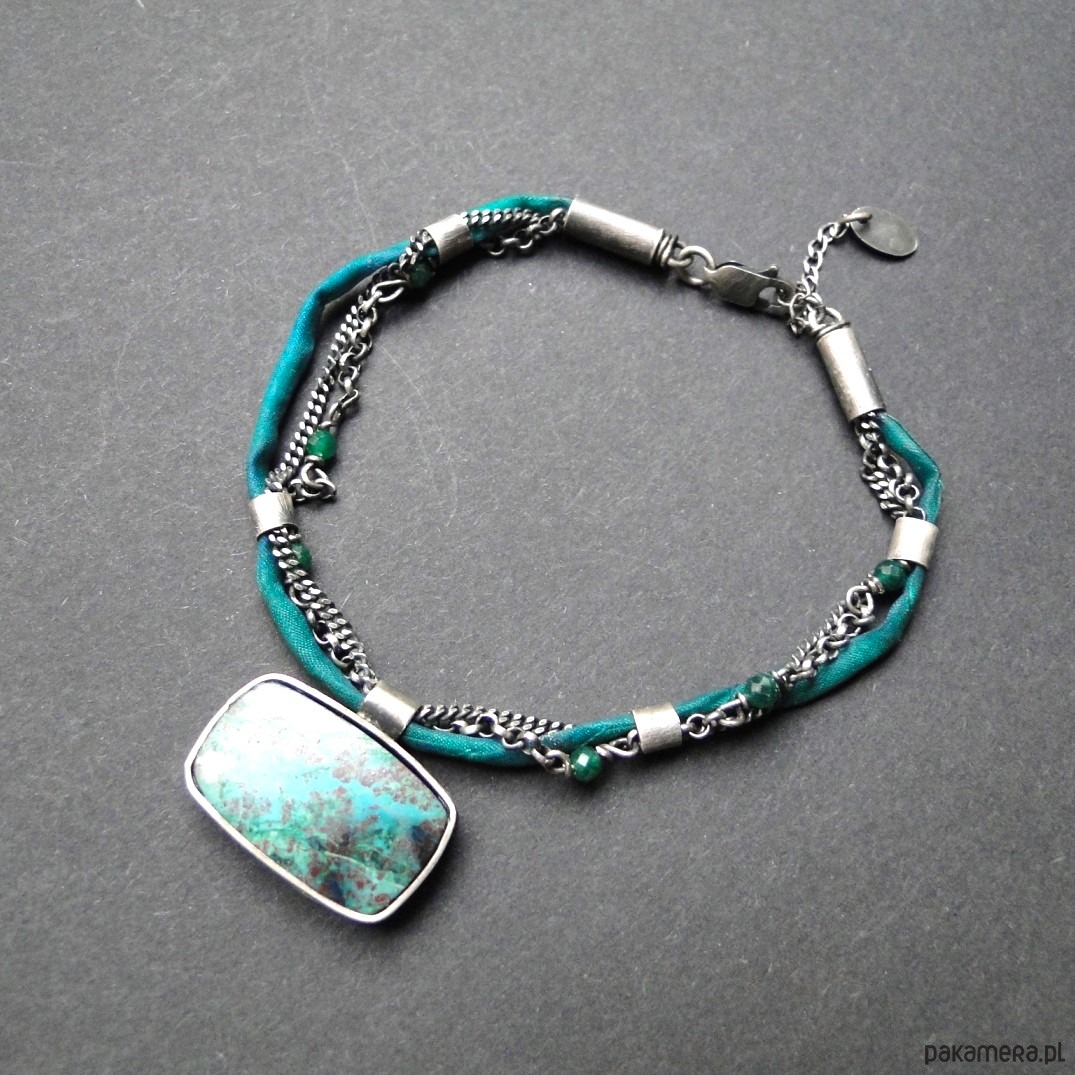 Surowa bransoleta w modnym kolorze. Wg Pantone odcień transformative teal (deep teal), morski,jest typowany jako kolor roku 2026 (obok ciemnego brązu). Chcesz być w trendach i kochasz te odcienie? Bransoleta otwiera moja kolekcję w morskich odcieniach. Wykonana z ręcznie barwionego naturalnego jedwabiu,srebra 925, chryzokoli i szmaragdów. Srebro oksydowane i szorowane. Pasuje na rękę 16-17cm,lekka regulacja. Nie moczyć w wodzie. Do kompletu polecam kolczyki(jedyne).