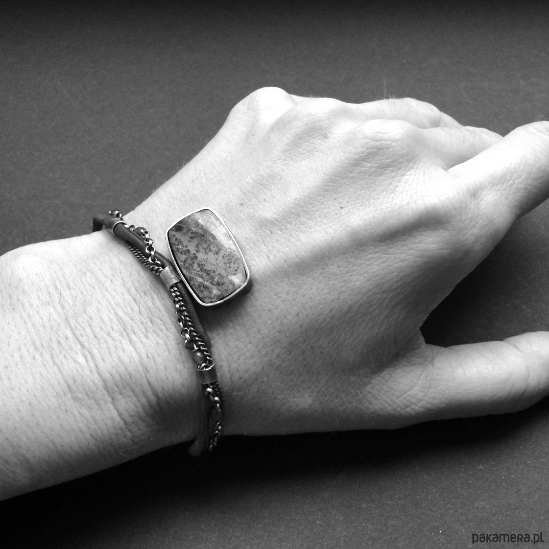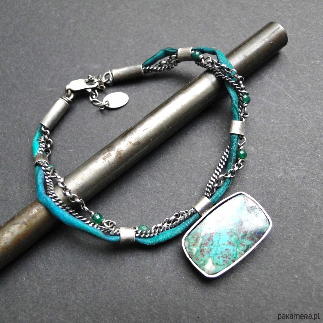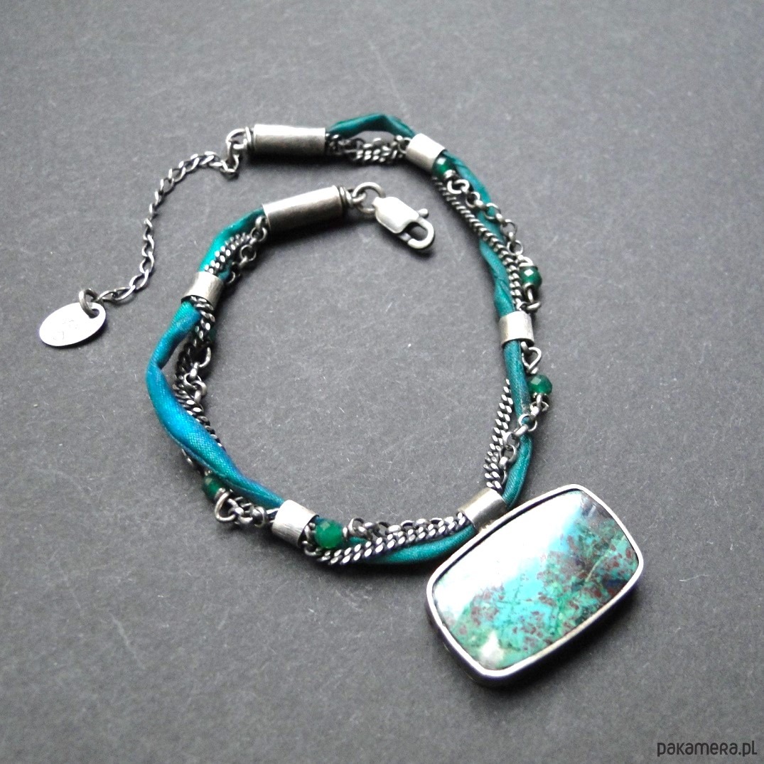 Surowa bransoleta w modnym kolorze. Wg Pantone odcień transformative teal (deep teal), morski,jest typowany jako kolor roku 2026 (obok ciemnego brązu). Chcesz być w trendach i kochasz te odcienie? Bransoleta otwiera moja kolekcję w morskich odcieniach. Wykonana z ręcznie barwionego naturalnego jedwabiu,srebra 925, chryzokoli i szmaragdów. Srebro oksydowane i szorowane. Pasuje na rękę 16-17cm,lekka regulacja. Nie moczyć w wodzie. Do kompletu polecam kolczyki(jedyne).