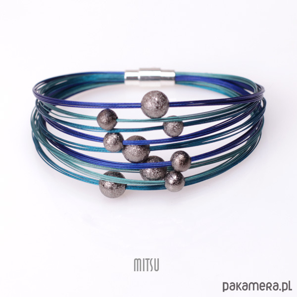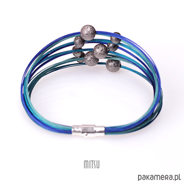 Bransoletka zbudowana ze stalowych linek krytych nylonem w kolorach kobaltowy, turkusowy, lazurowy.