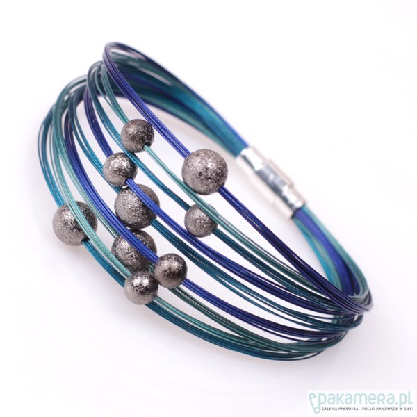 Bransoletka zbudowana ze stalowych linek krytych nylonem w kolorach kobaltowy, turkusowy, lazurowy.