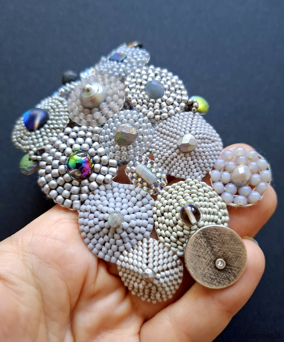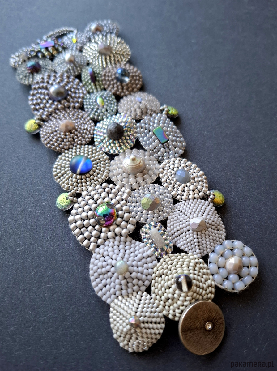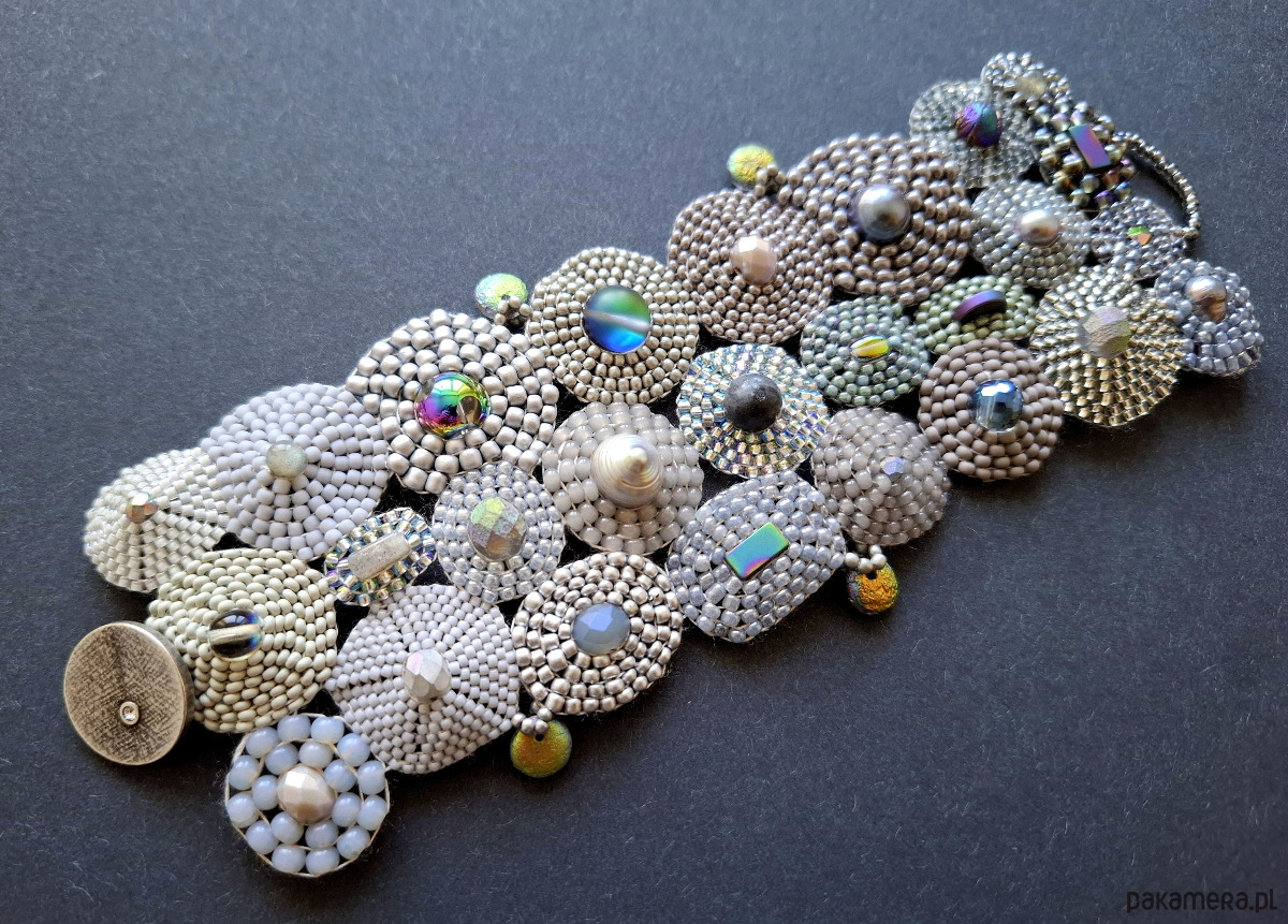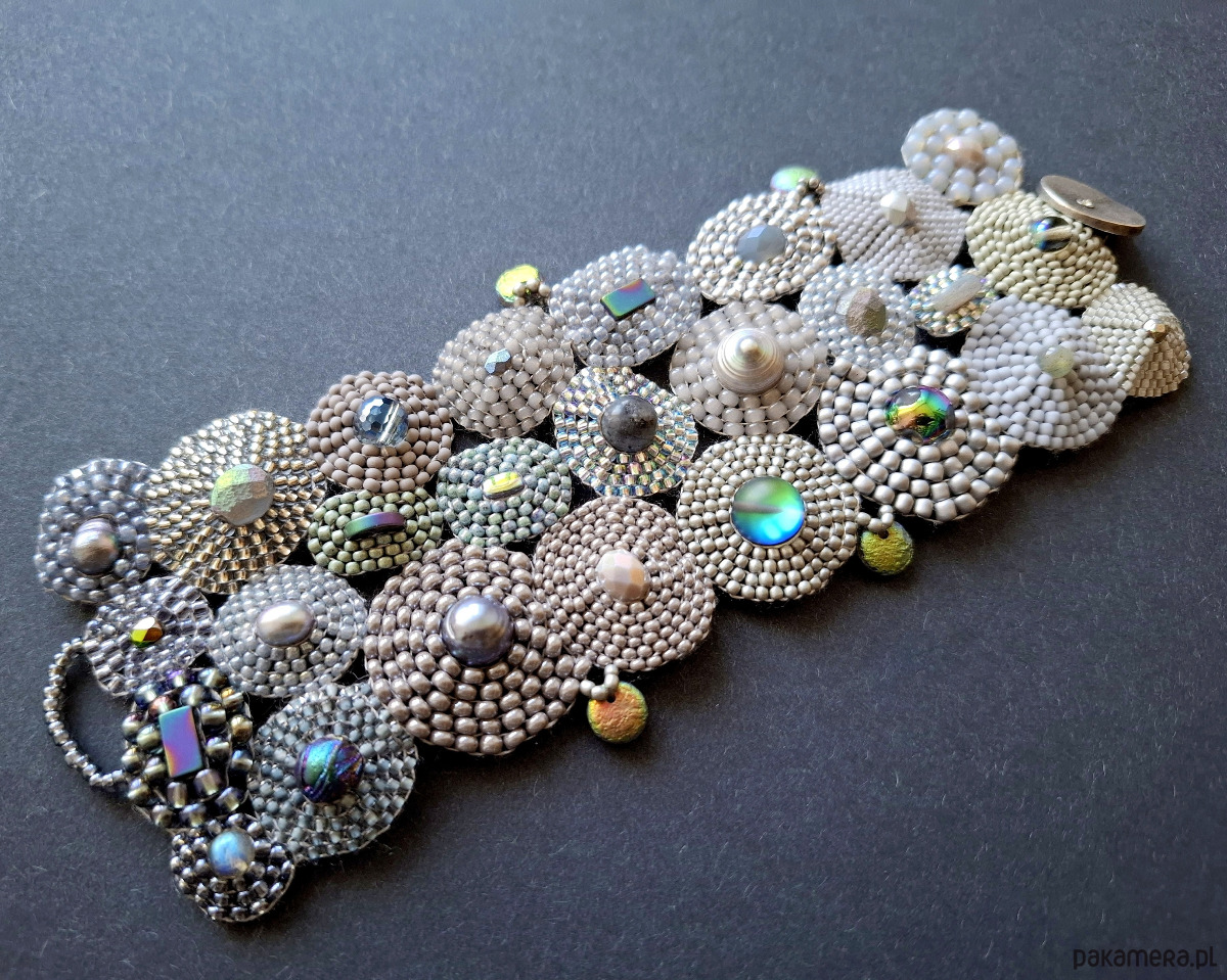 Ażurowa bransoleta wykonana techniką swoistego haftu drobnymi, szklanymi koralikami w połączeniu z naturalnymi perłami, labradorytem, hematytem platerowanym i lavrikitem. Dwustronna, zapinana na ozdobny, metalowy guzik. Wykonana w jedynym egzemplarzu. Wymiary: długość wraz z zapięciem: 17,5 cm, szerokość ok. 6,5 cm.