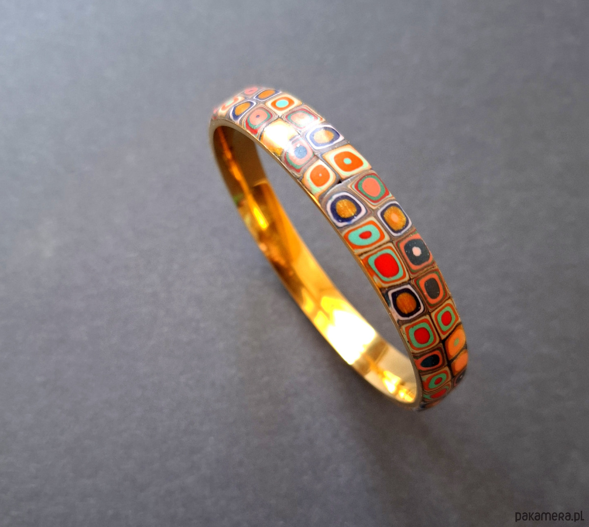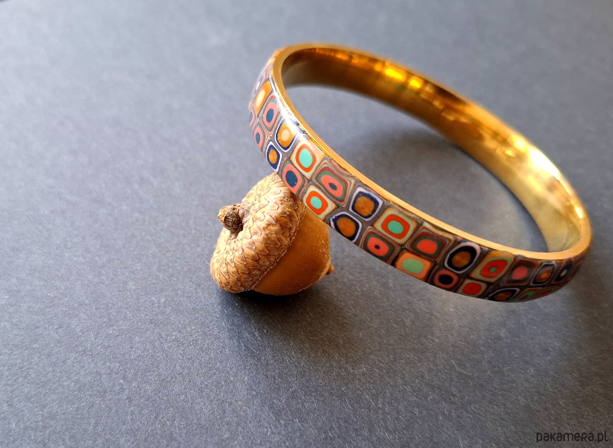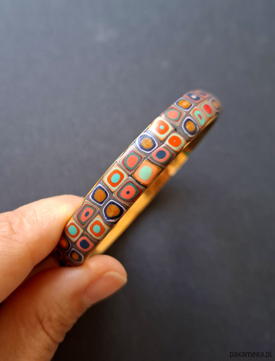 Bransoleta wykonana z połączenia wysokiej jakości glinki polimerowej ze stalą szlachetną w złotym kolorze. Szerokość: 1 cm. Wykonana w jedynym egzemplarzu.