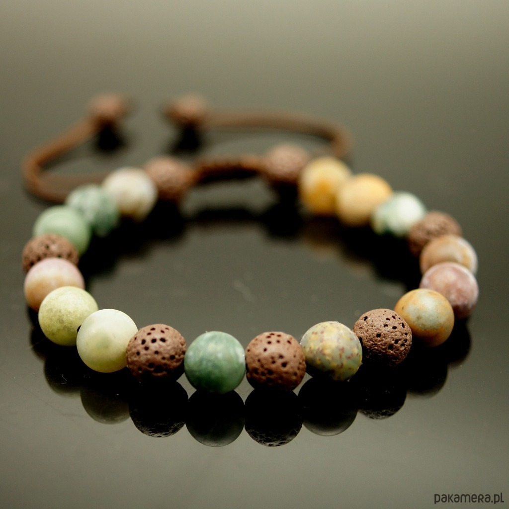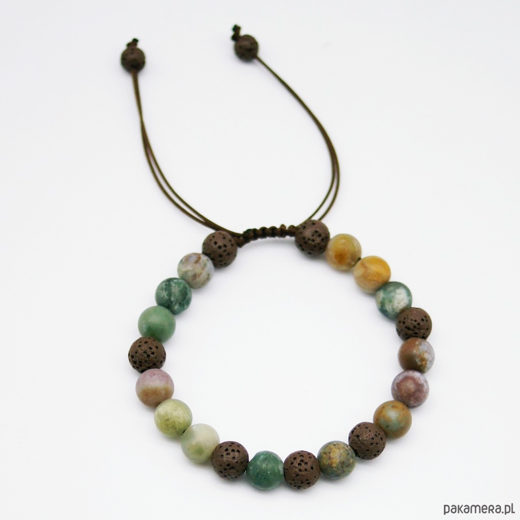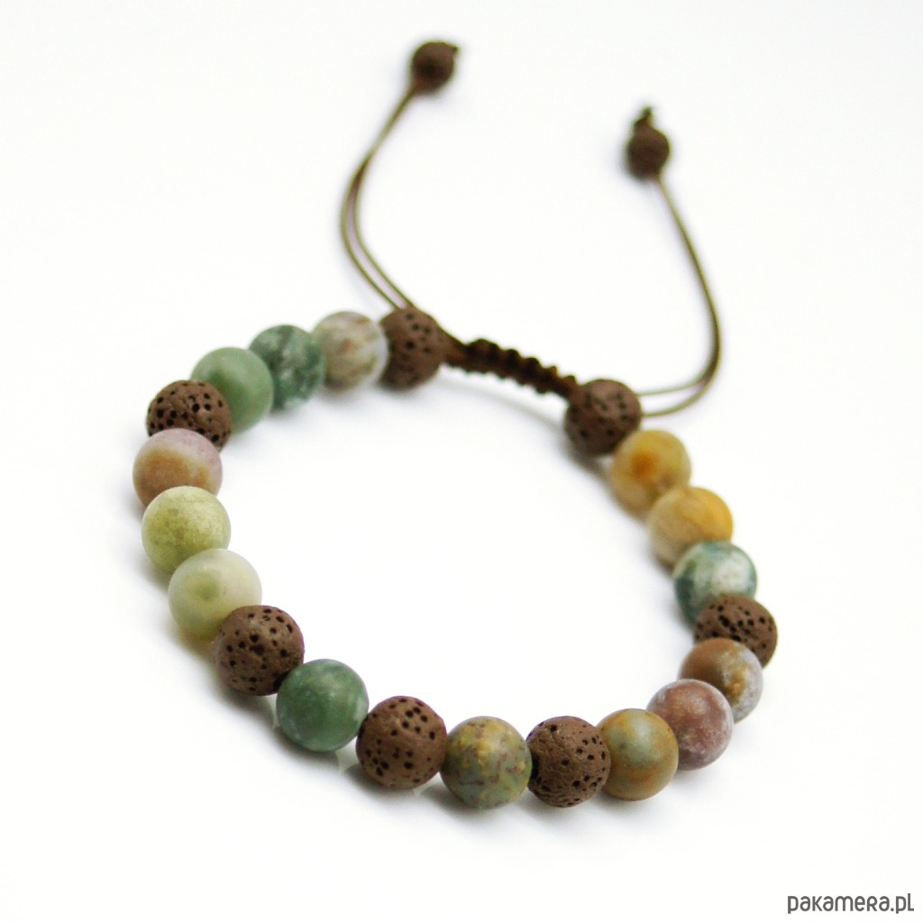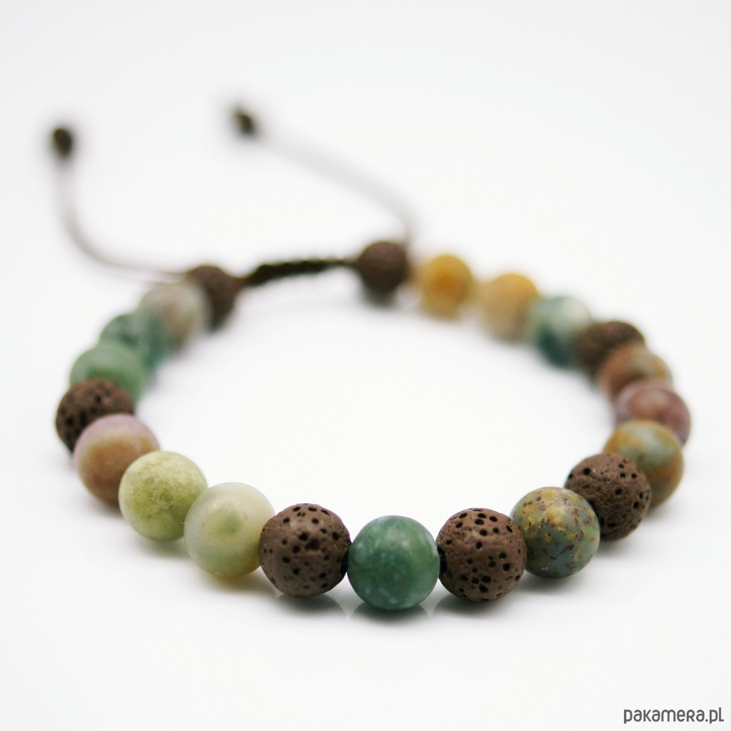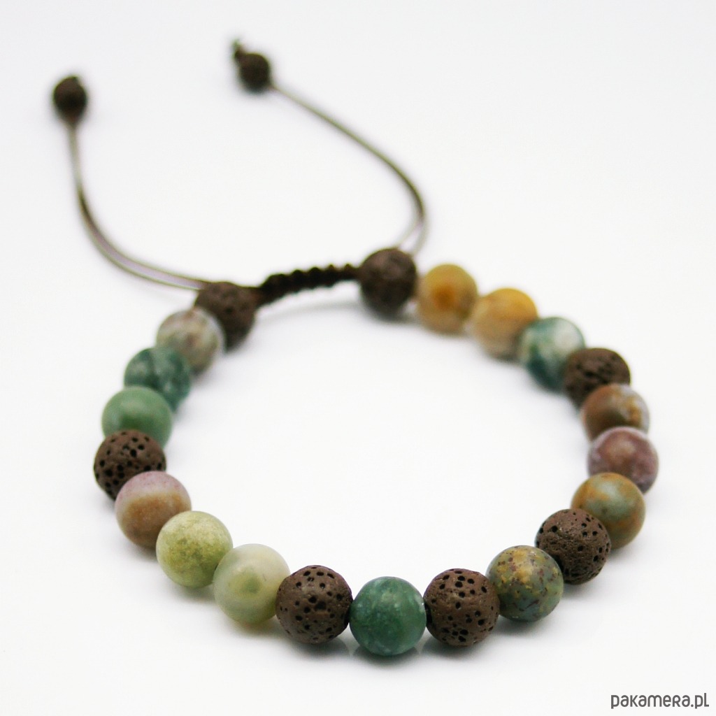 Męska bransoletka na mocnym i wodoodpornym sznurku nylonowym. Wykonana z matowych kulek agatu indyjskiego oraz porowatej lawy wulkanicznej (8mm).
