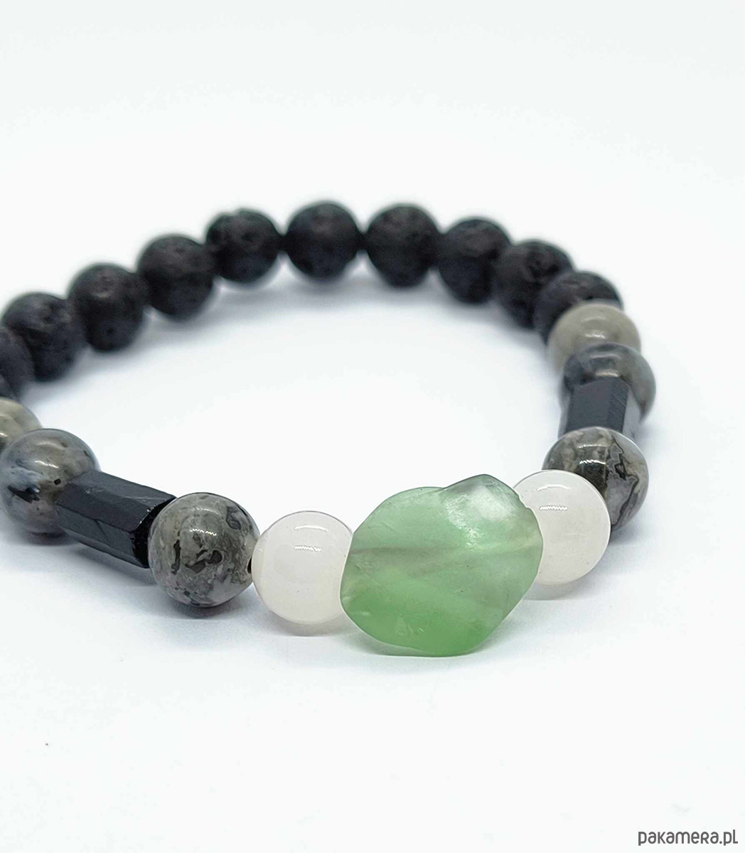 materiał: naturalny fluoryt, kwarc różowy, czarny turmalin,jaspis szary, larvikit, lawa wulkaniczna