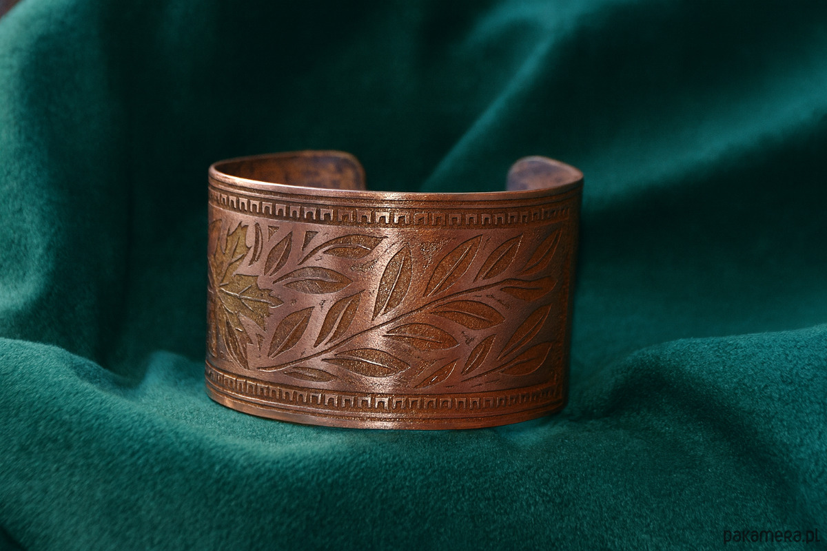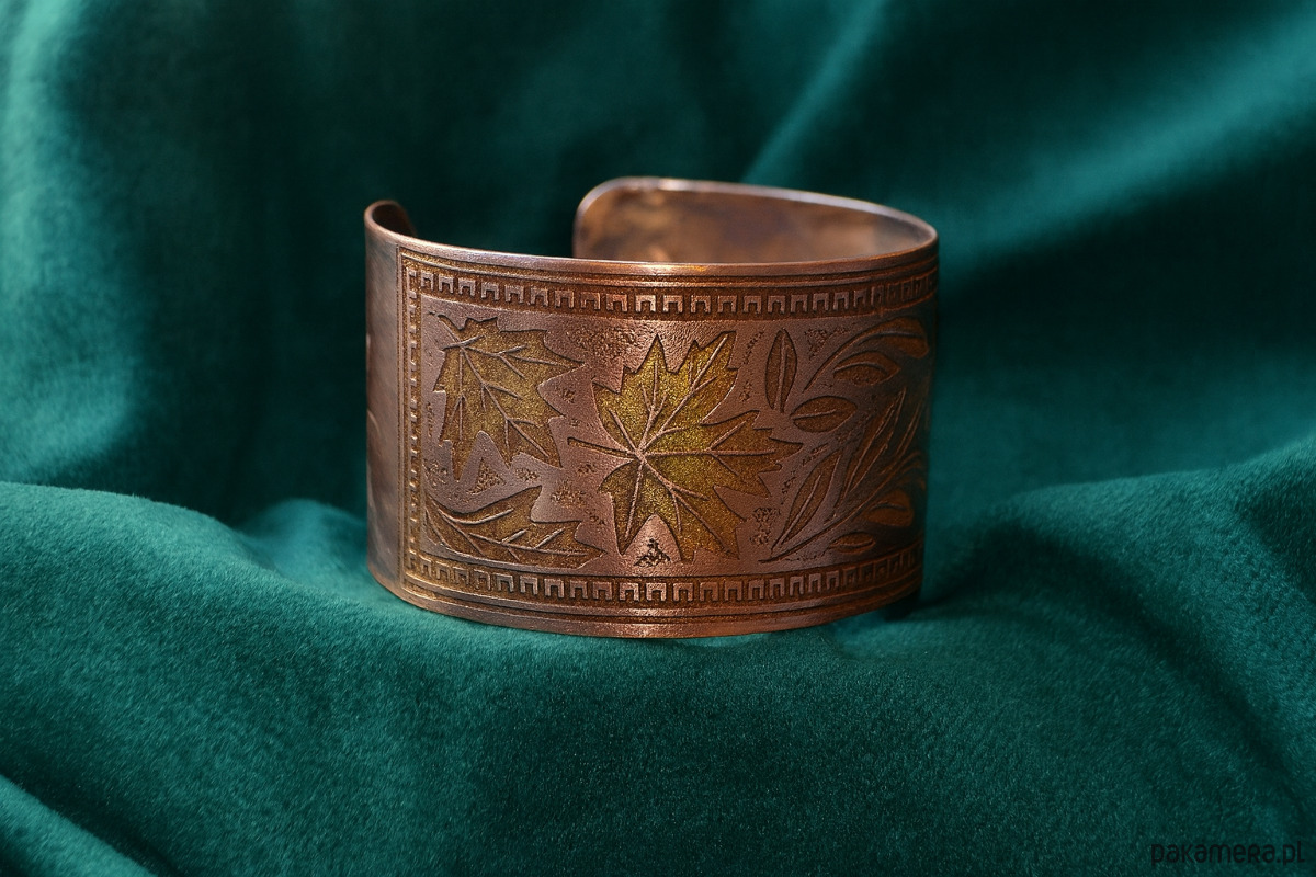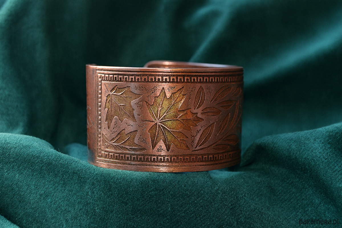 Unikatowa, szeroka bransoleta wykonana techniką graweru chemicznego.