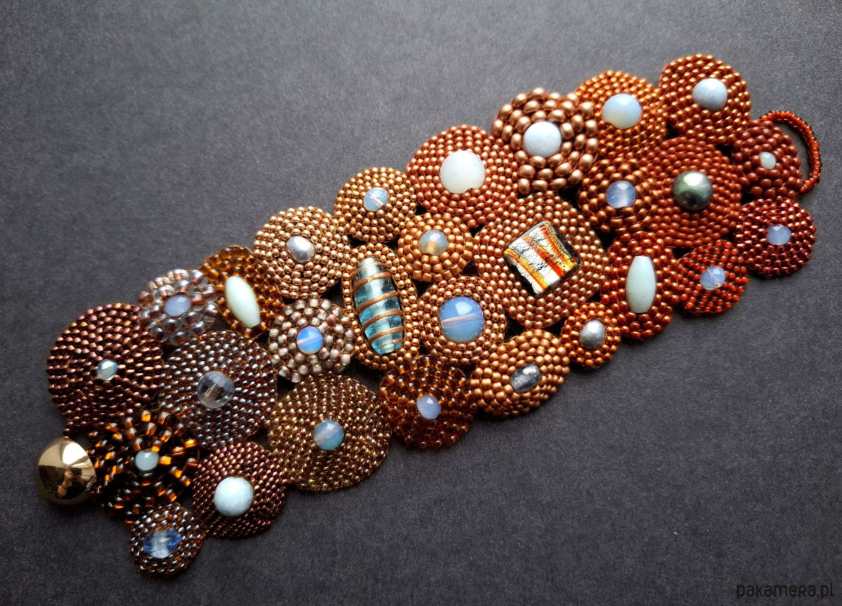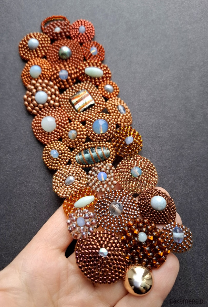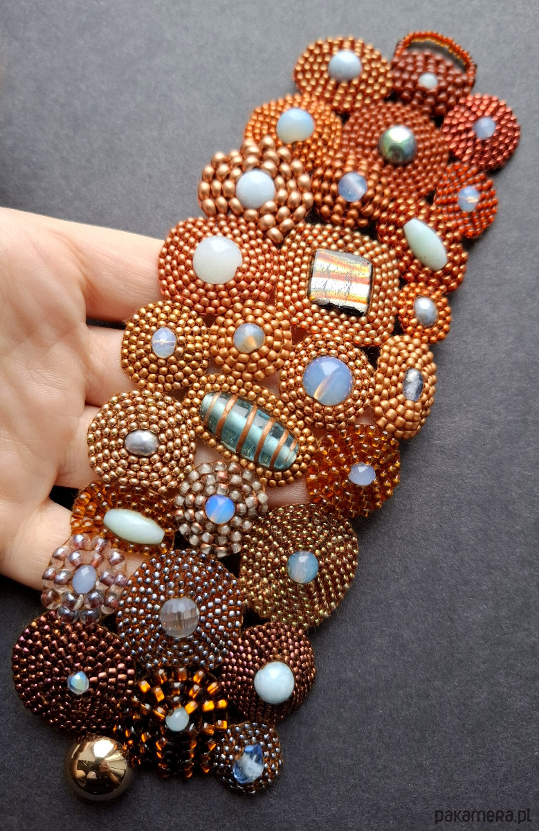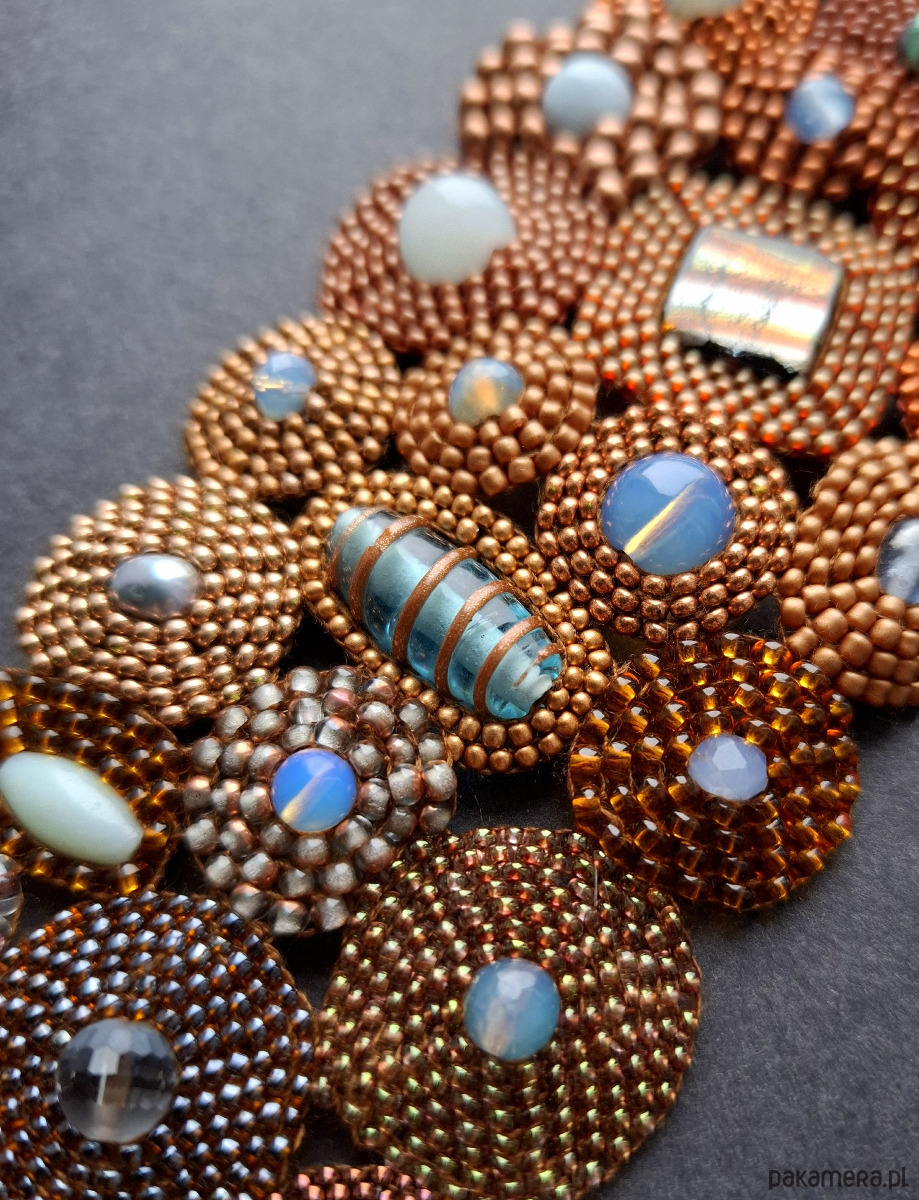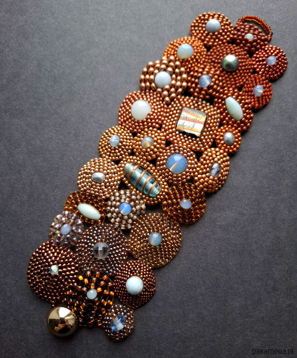 Ażurowa bransoleta wykonana techniką swoistego haftu drobnymi, szklanymi koralikami w połączeniu z naturalnymi perłami, jadeitami, agatami, akwamarynami oraz opalem syntetycznym. Dwustronna, zapinana na ozdobny, metalowy guzik. Wykonana w jedynym egzemplarzu. Wymiary: długość wraz z zapięciem: 17,5 cm, szerokość ok. 7 cm.