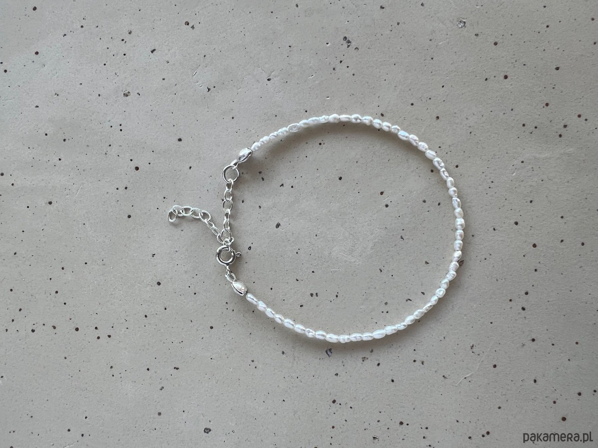 Bransoletka wykonana z nieregularnych perełek hodowlanych, tzw. ryżu. Wielkość perełek 1-3 mm.